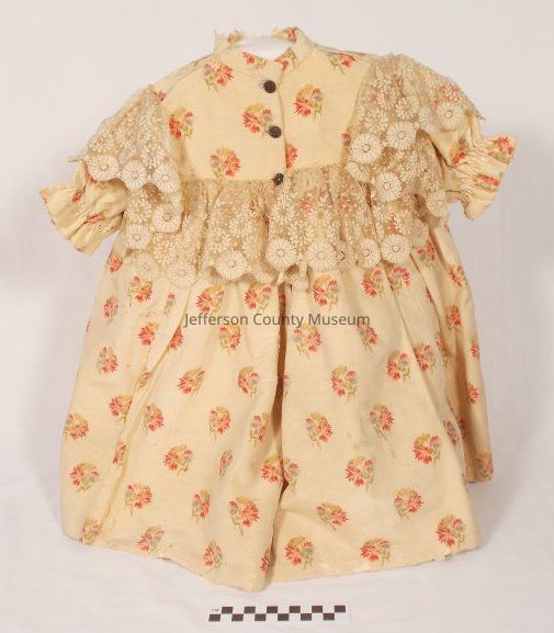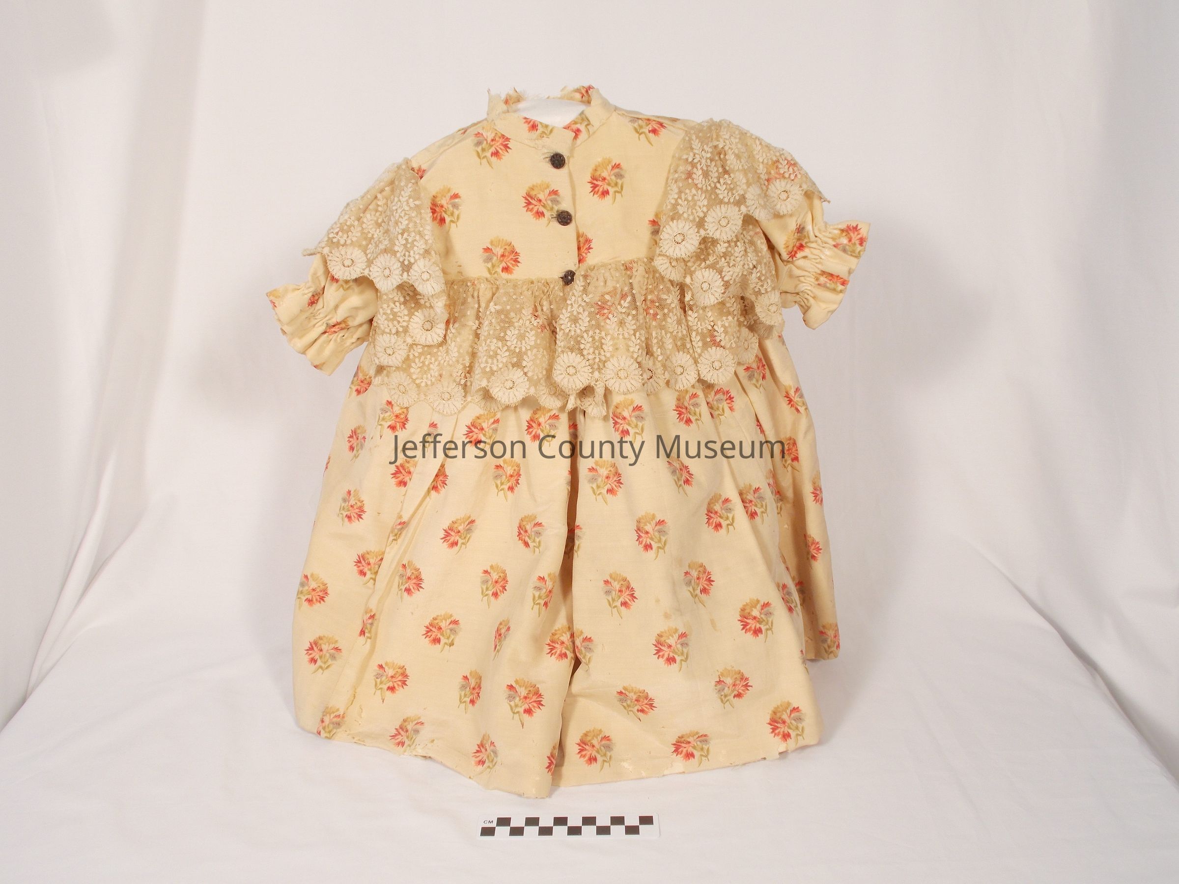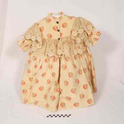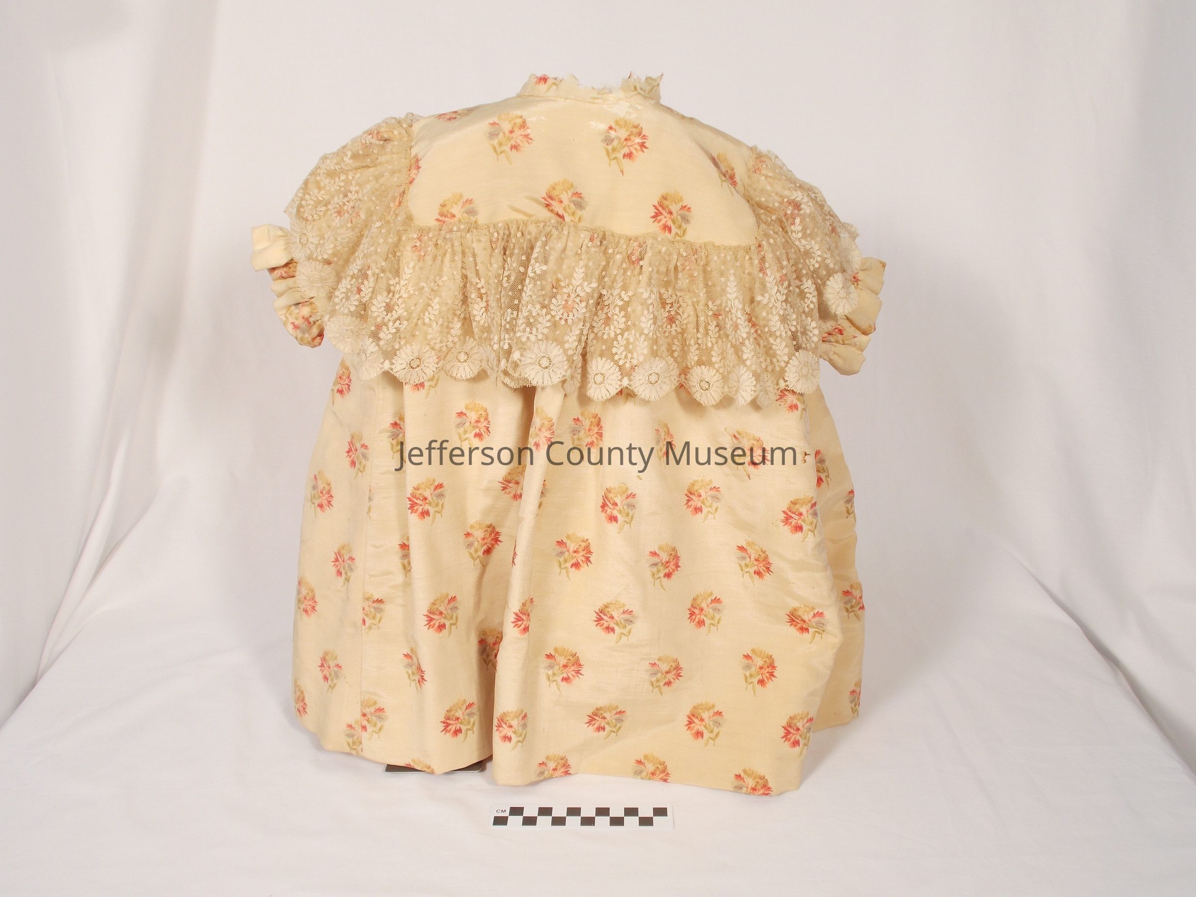 Child's dress hand-made of silk, silk/satin and lace. The dress is cream colored with a flower pattern. The flowers are brown, red and light gray. Dress is lined with silk/satin; lace collar goes all the way around dress; short, puffed sleeves. In front the collar is below the neck-line. Three buttons on back. Two still have rhinestones.Acquisition