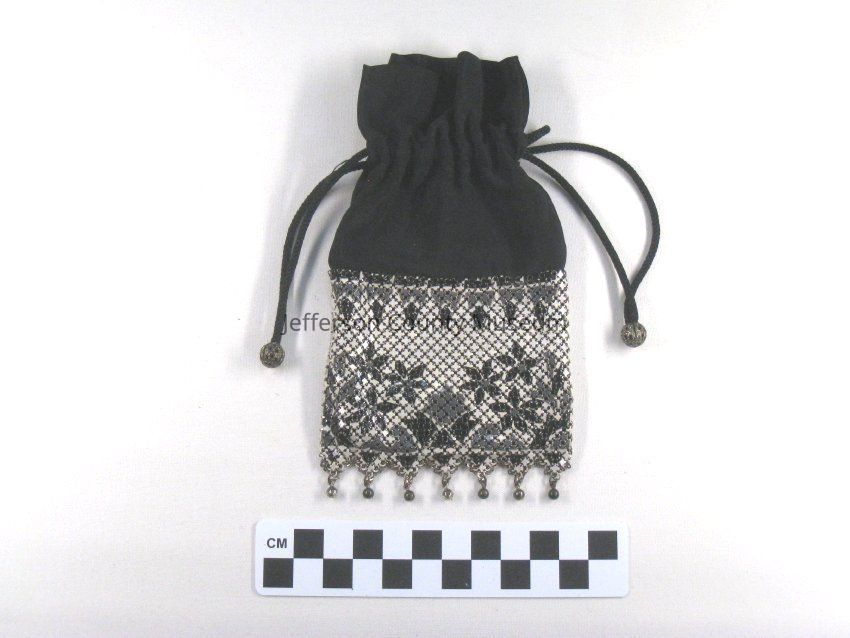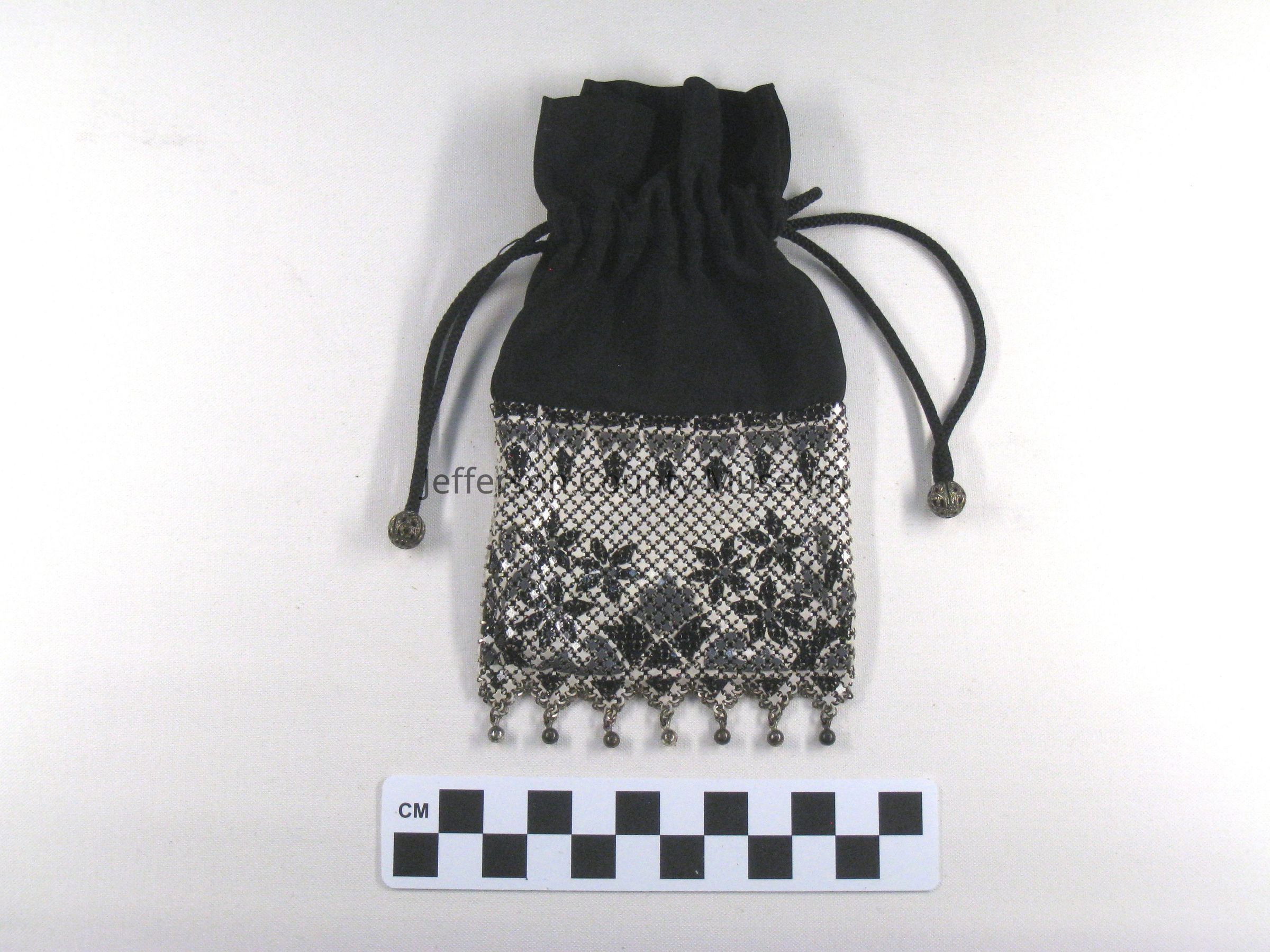 Small lady's purse with black fabric drawstring top and linked black, white and gray metal pieces that form the bottom half. The metal pieces are linked together to form a flexible, almost fabric feel. Small round metal beads attached to bottom.Acquisition