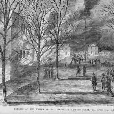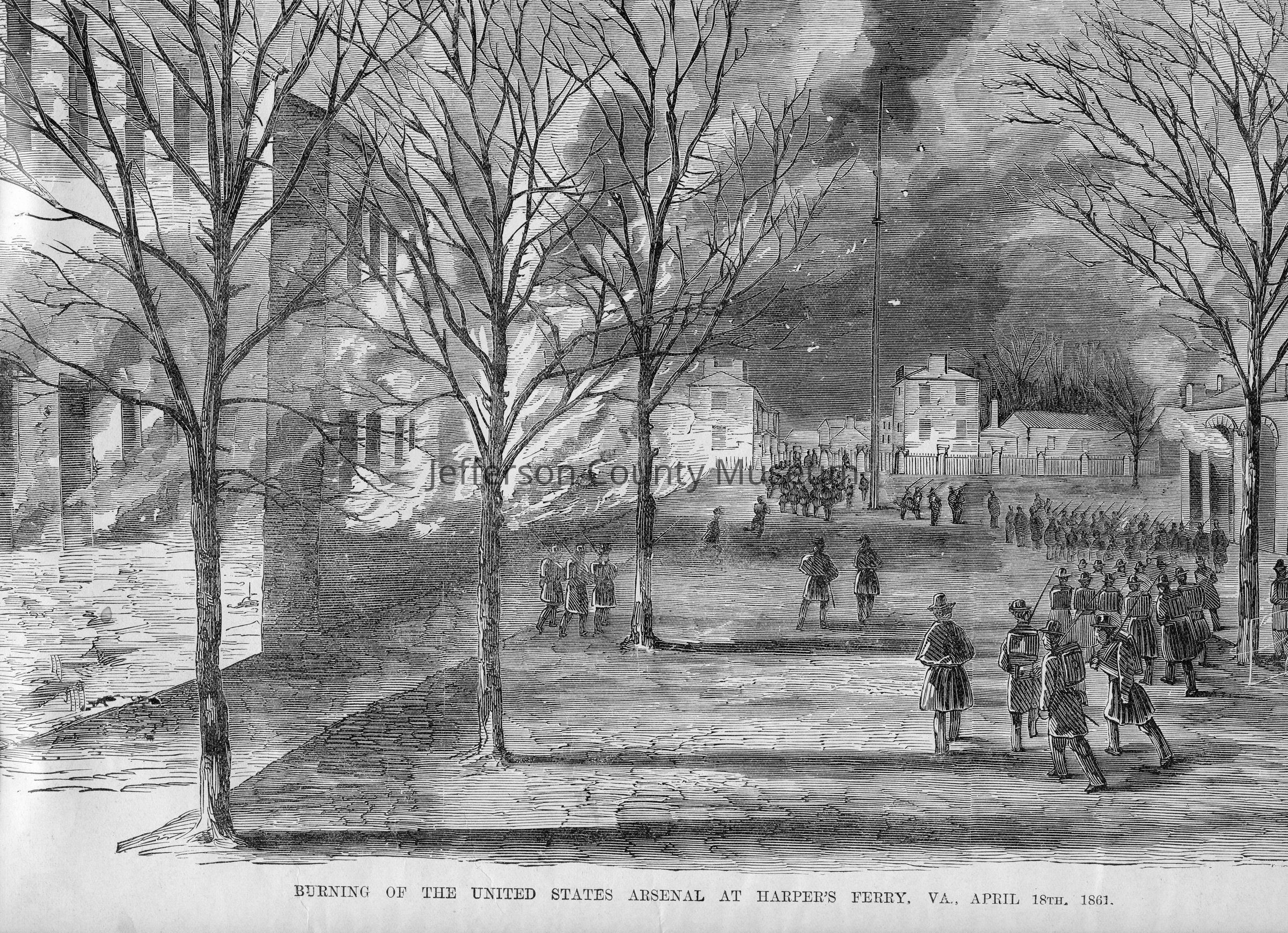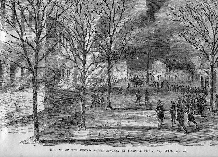 IMG3261-8: Burning of the United States Arsenal At Harper's Ferry, VA, April 18, 1861, from unspecified newspaper, page 64, with heading The Soldier In Our Civil War.