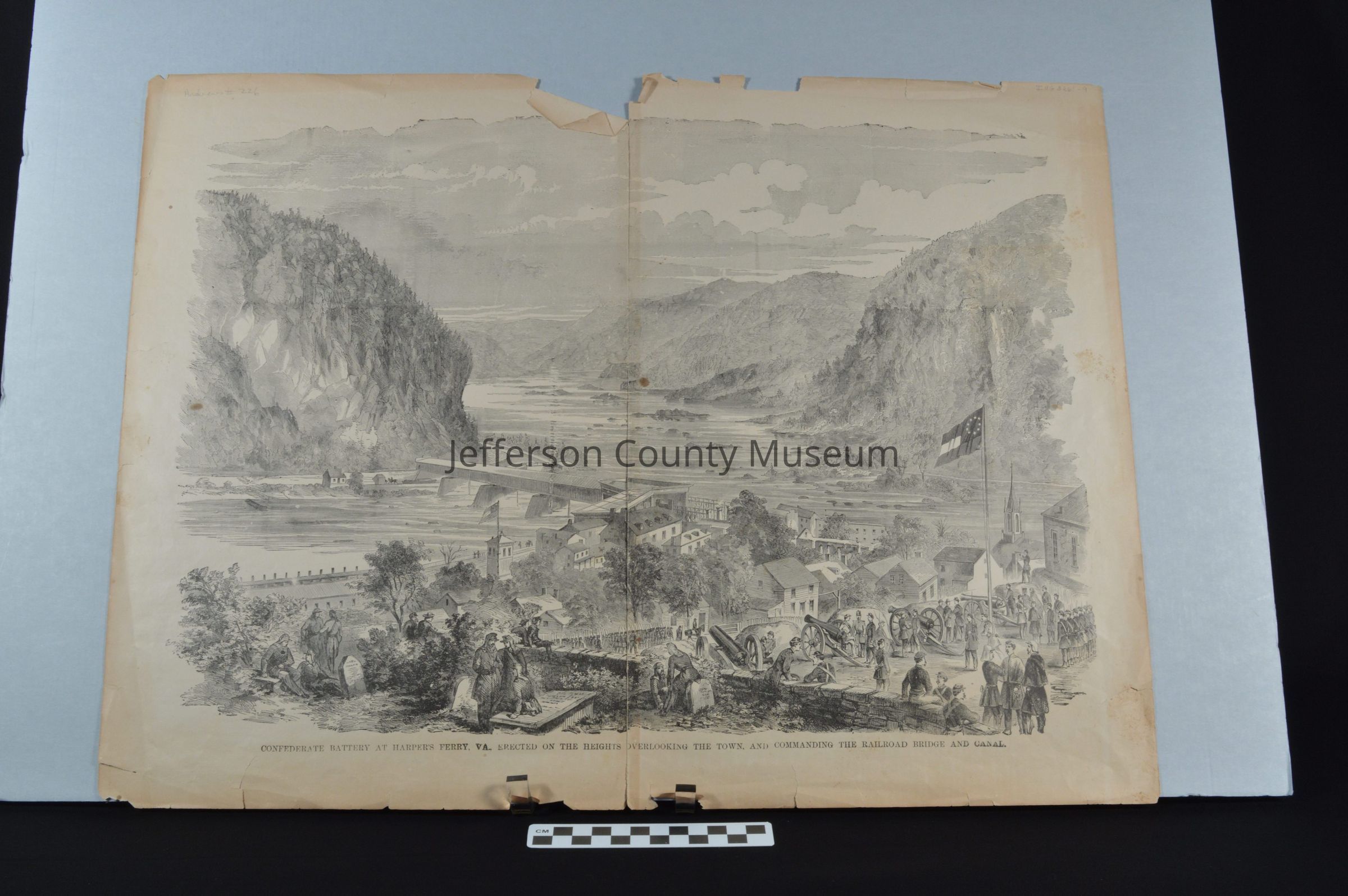 IMG3261-9: Confederate Battery At Harper's Ferry, VA, Erected On The Heights Overlooking The Town, And Commanding The Railroad Bridge And Canal, from unspecified newspaper, pages 393-396, heading of The Soldier In Our Civil War. Print on page 393 is of Joseph Hooker and Joseph K. F. Mansfield. Additional print on page 396 titled Women And Children Of Sharpsburg, MD, Taking Refuge In The Cellar Of The Kretzer Mansion During The Battle, Bursting Of A Shell In The Window Of The Cellar, Sketch by F. H. Schell.