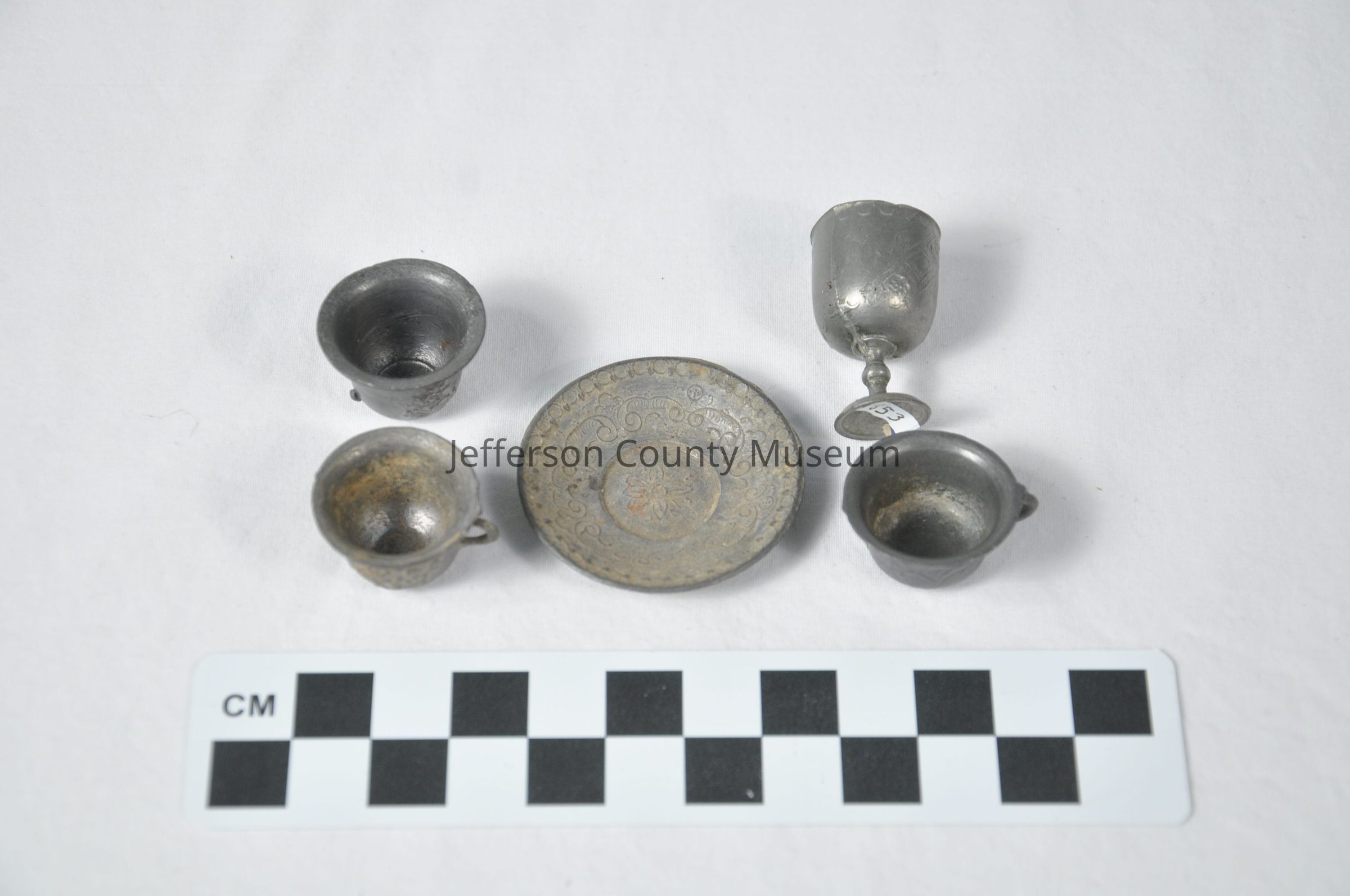 Small pewter play set probably for a doll house. There are three cups, one plate and one goblet. There are floral or other designs on each piece. The handle is broken off one of the cups.Acquisition