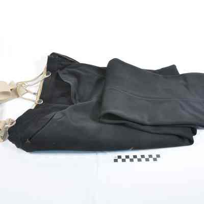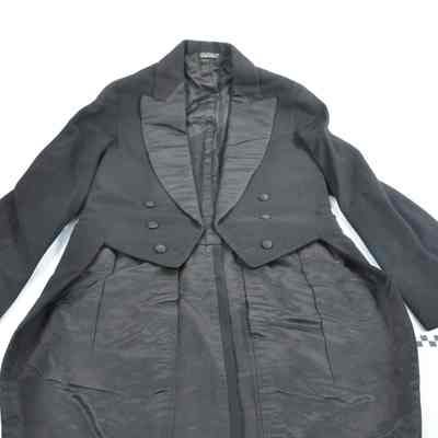 Tuxedo with jacket with tails, two pairs of pants, one with white suspenders and a vest. The jacket has satin lapels and six satin buttons on front. Also has two satin buttons on each cuff and two satin buttons in back. Label on collar says "Meltsner's Progress". Pants with suspenders has small metal buckle in back. Pants without suspenders has buckle on each side of waist and five satin buttons for suspenders. One button is missing. The vest has four satin buttons, two pockets and a buckle in back.Acquisition