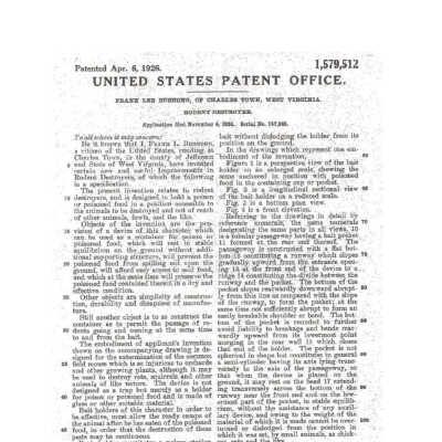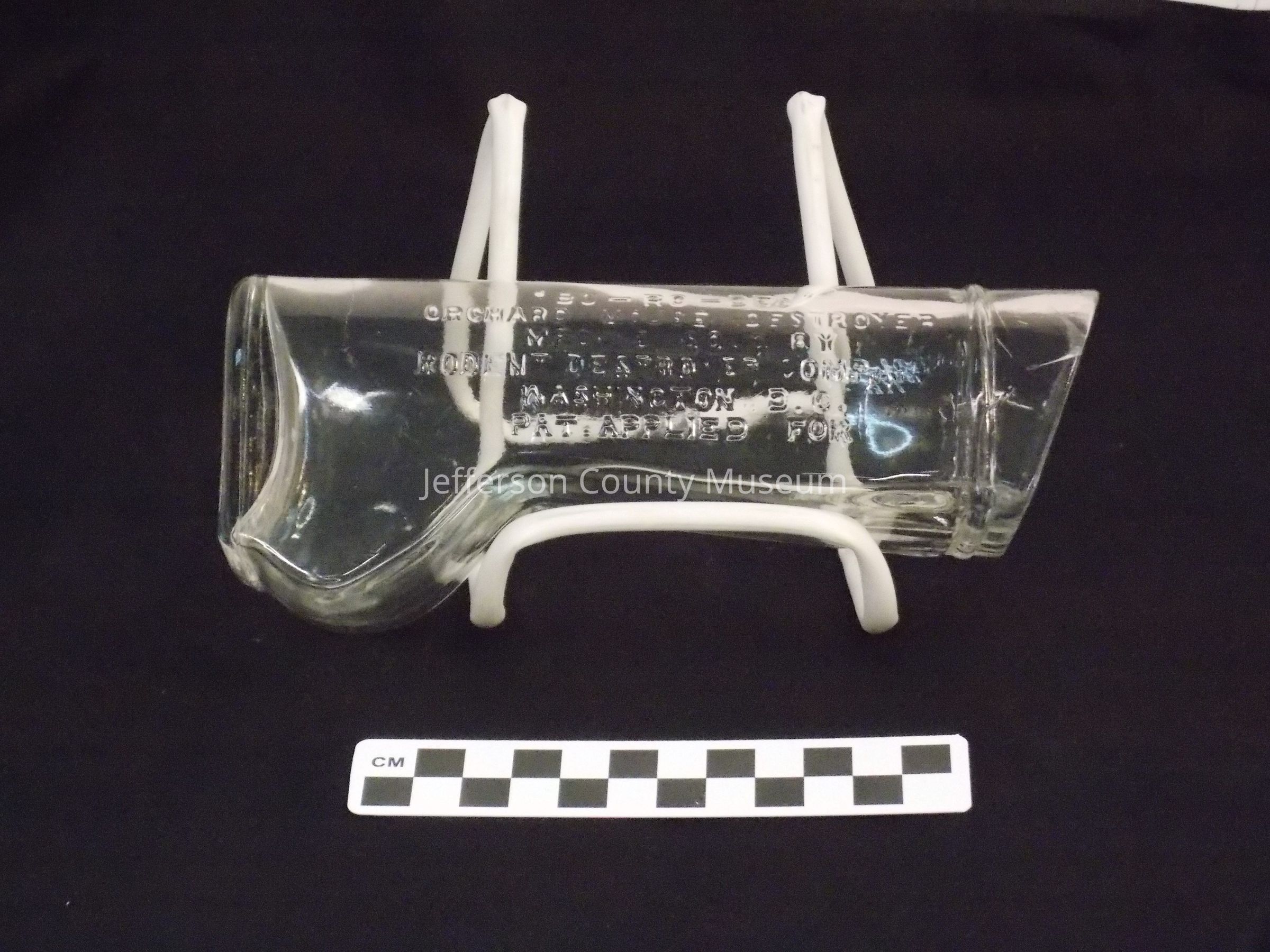 Glass rodent baiter (not a trap). This was designed to hold poison that the rodent would go in and eat and then leave. It was designed so that rain could not get in it. Embossed on the glass " 'BU-RO-DES' ORCHARD MOUSE DESTROYER MFG. & SOLD BY RODENT DESTROYER COMPANY WASHINGTON, D. C. PAT. APPLIED FOR".Acquisition