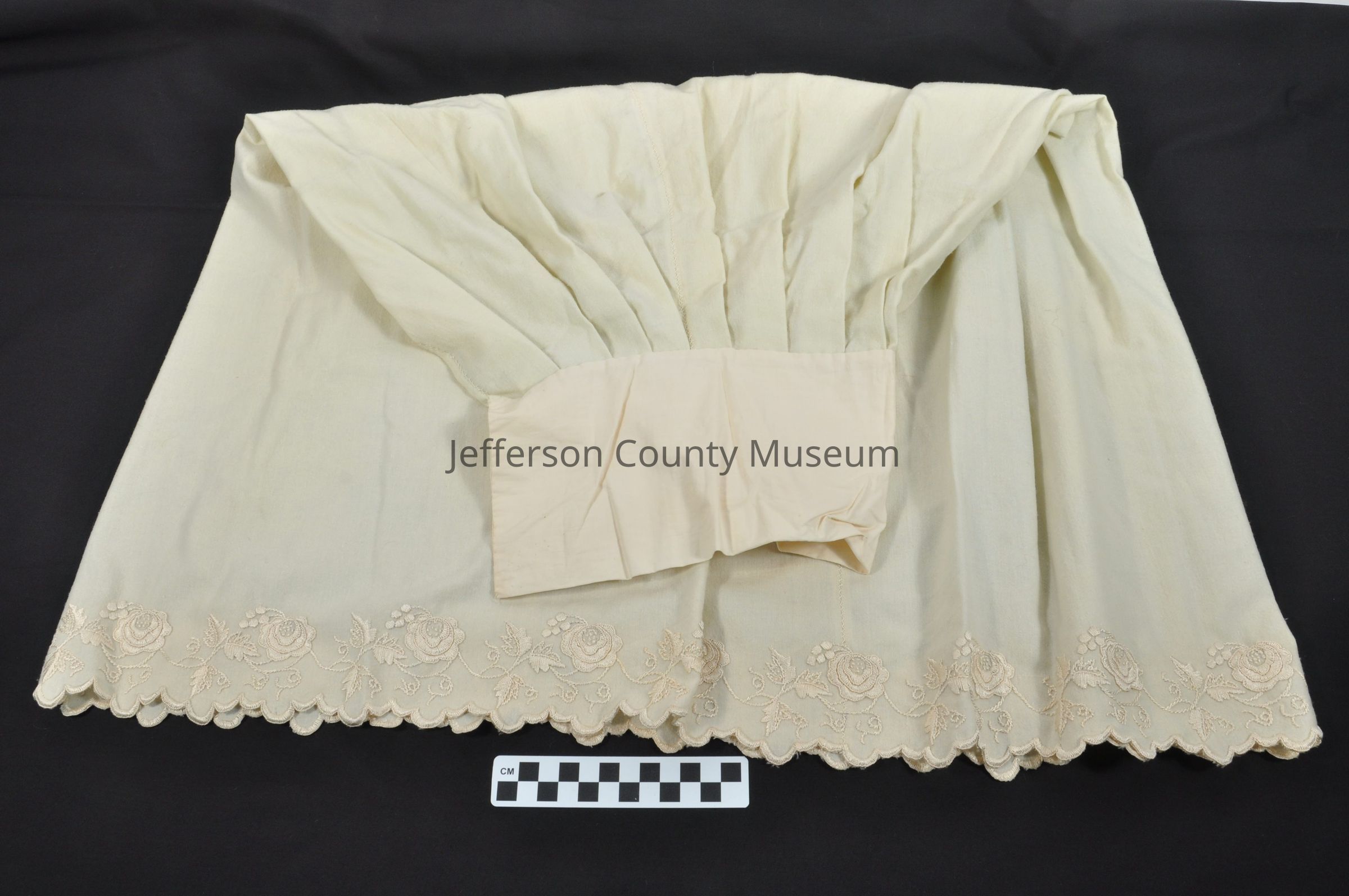 Off-white petticoat for small woman or girl. Split down back. Rose pattern embroidered around bottom. Old number 559 has been written on the top inside the waistband in black marker.Acquisition