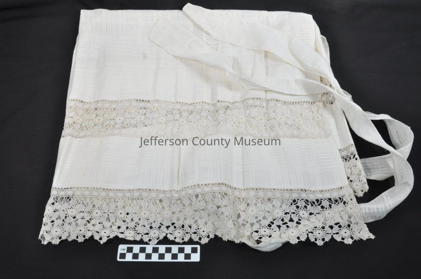 White, long party apron. Semi-sheer fabric with glossy white checker pattern throughout. Narrow waistband with two ties wider than the waistband. Old number 1123 written in black marker on waistband. Two panels of crochet work on bottom.Acquisition