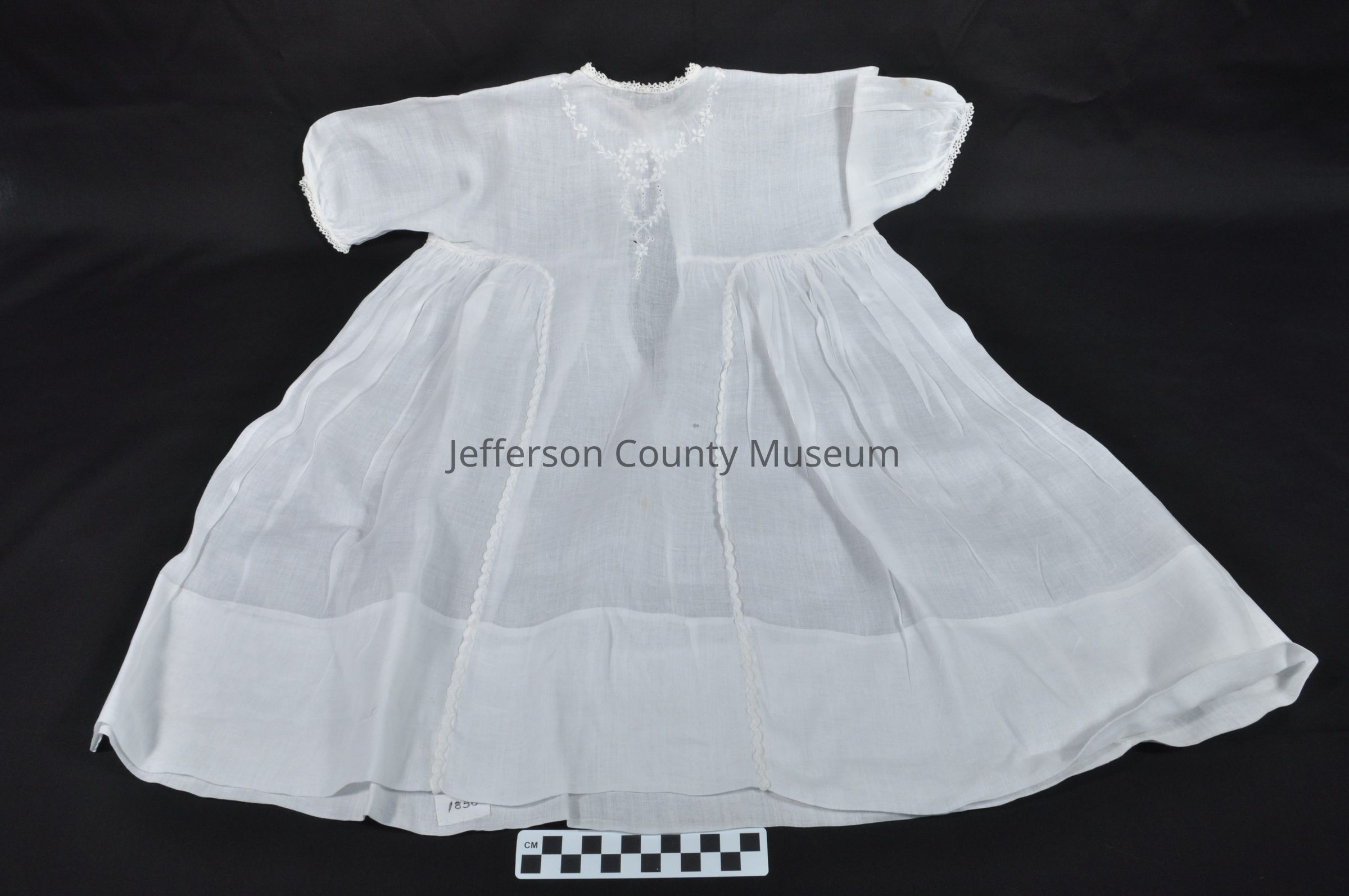 African American child's dress, white with embroidery work on bodice and down sides on front. Hand tatting around collar. Split down back to below waist.Acquisition