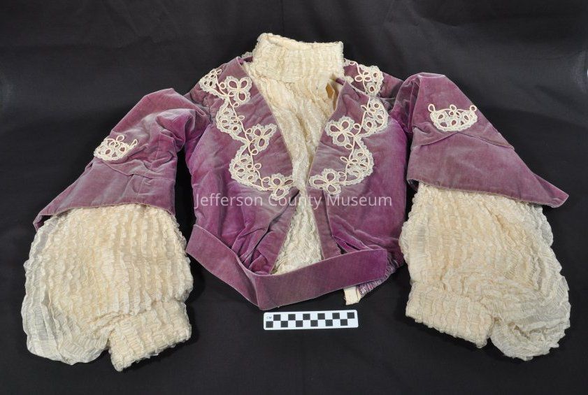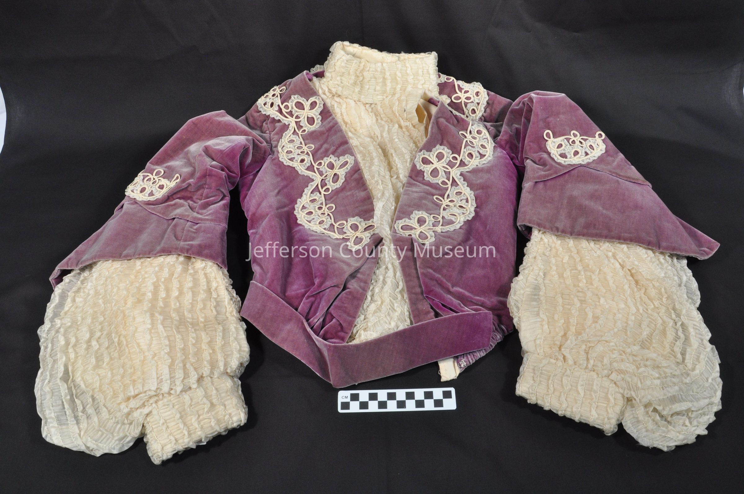 Lady's faded purple velvet jacket. Lace trim on sleeves, on front and around back. Attached balloon type tucked silk sleeves and jabot with high collar of fine ecru batiste. Velvet belt at waist.Acquisition