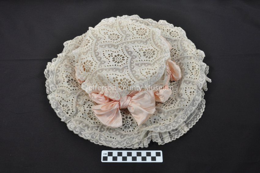 Cream lace hat with pink silk ribbon and pink silk flowers around crown. Hat has a thread covered wire form.