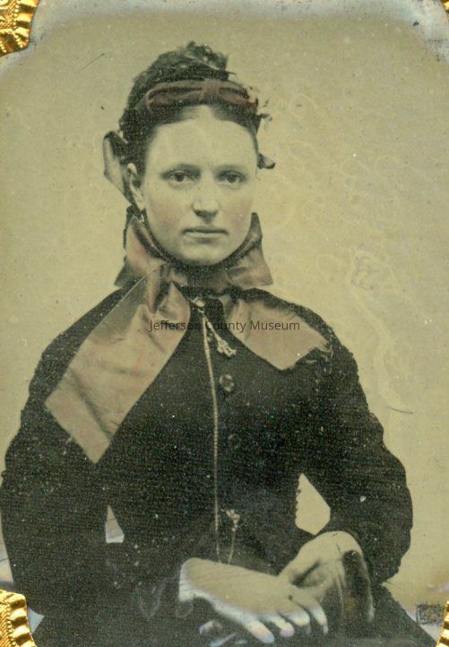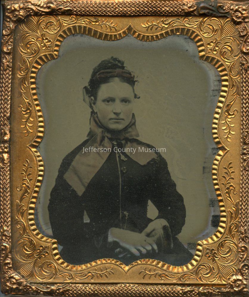 Tintype, believed to be Miss Alvernon Cross (b. ca. 1843), daughter of Ambrose and Margaret Cross of White Pillars, Harpers Ferry. On reverse "Old Tintype - Found in attic of house now known as White Pillars in Harper's Ferry, originally the Cross House, tintype is believed to be picture of the Crosses' daughter, Miss Alvernon Cross."