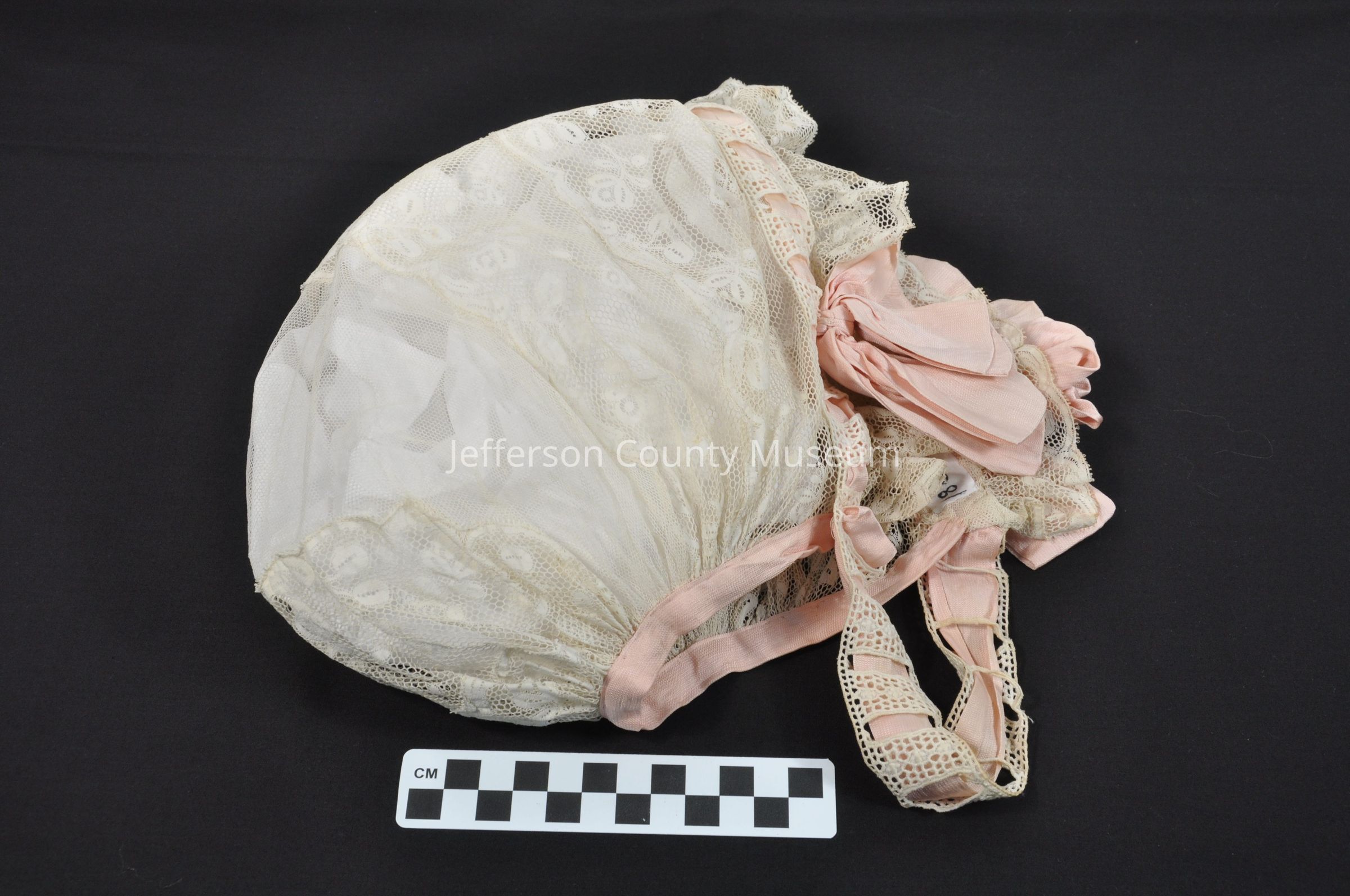 Lace cap with pink ribbon around edges and a gathering of pink ribbon into a bow on the left side.