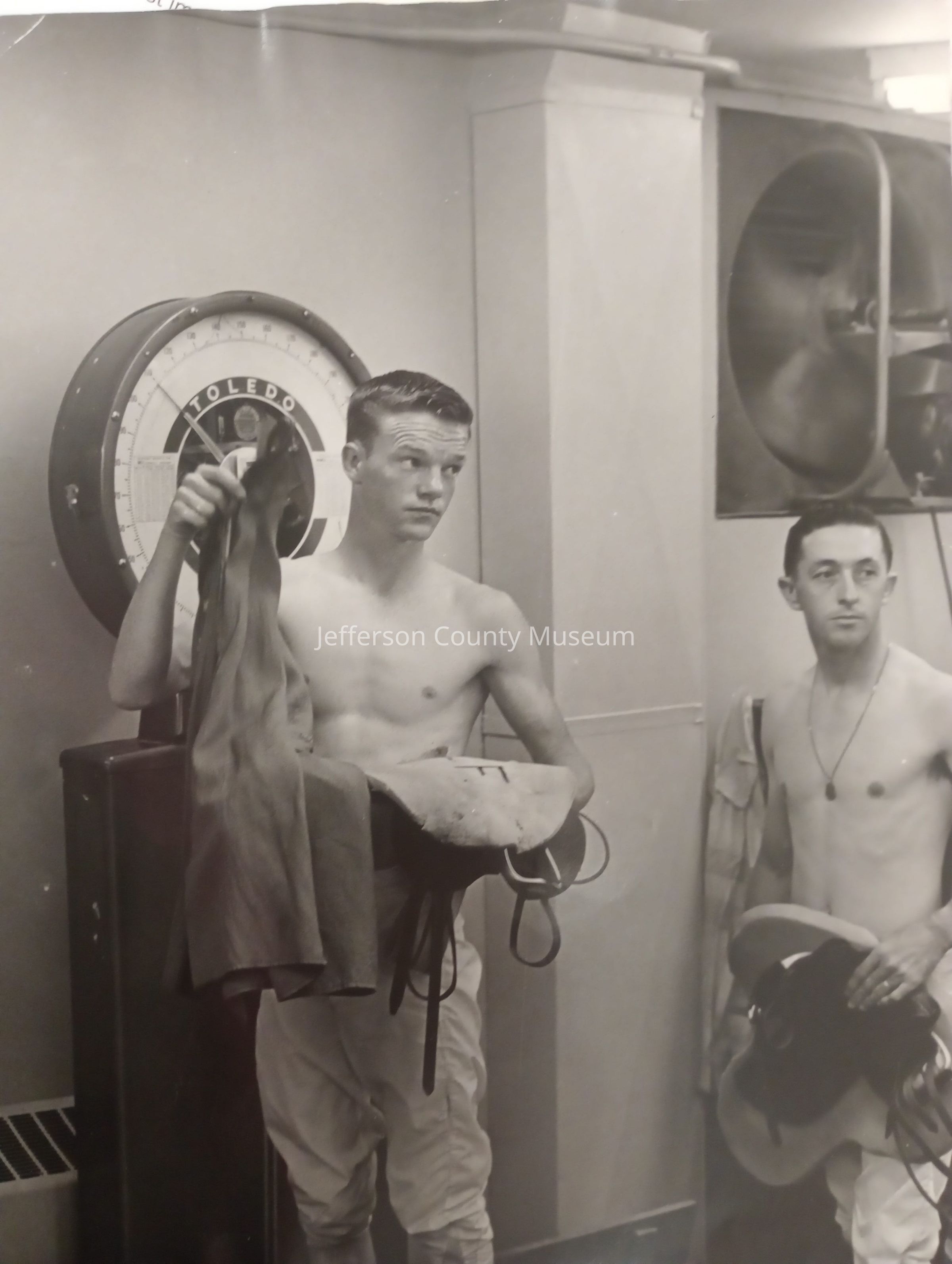 Black and white photograph of jockey Robert Wilson holding some of his gear, weighing in at the Charles Town races. An unidentified jockey stands in line behind him at right.Photograph Details