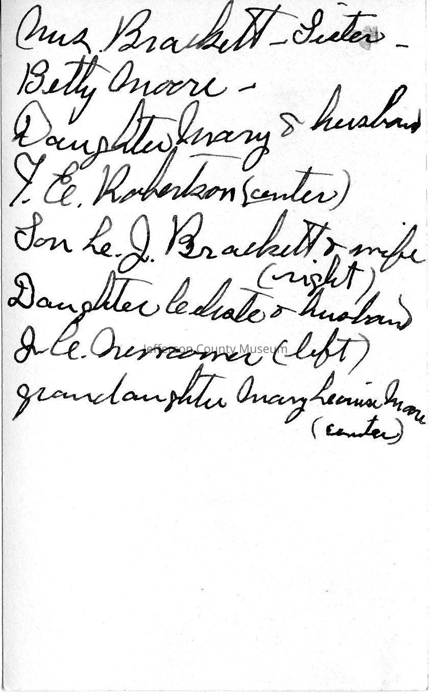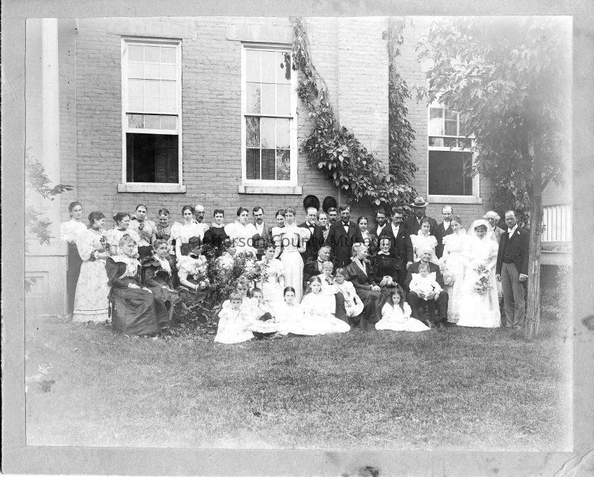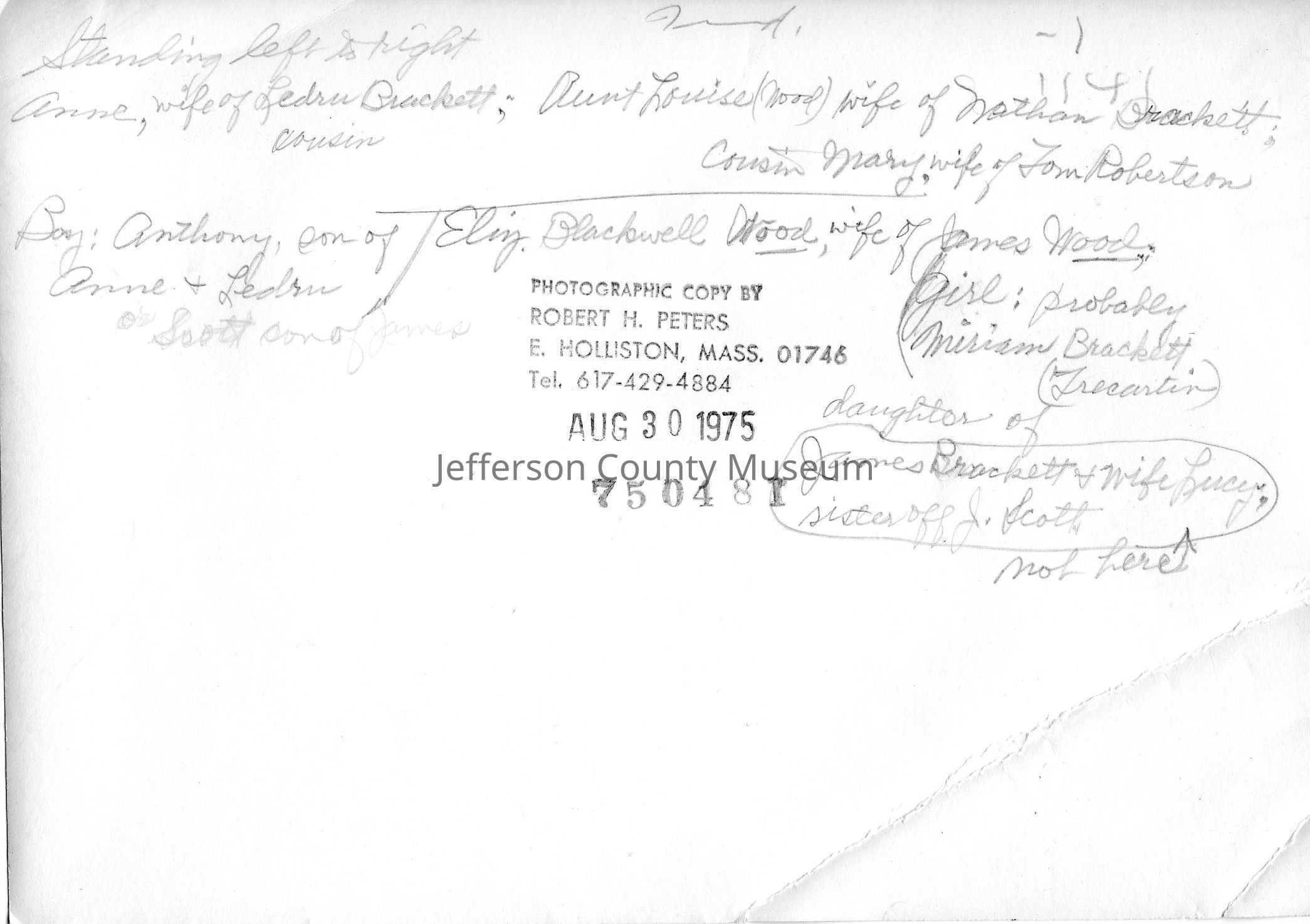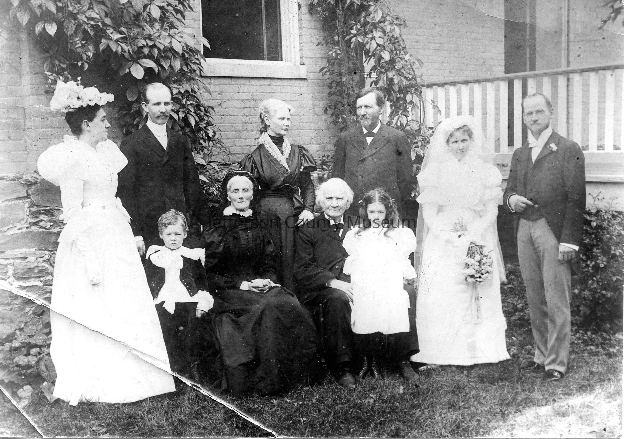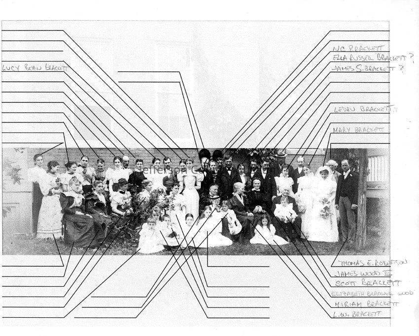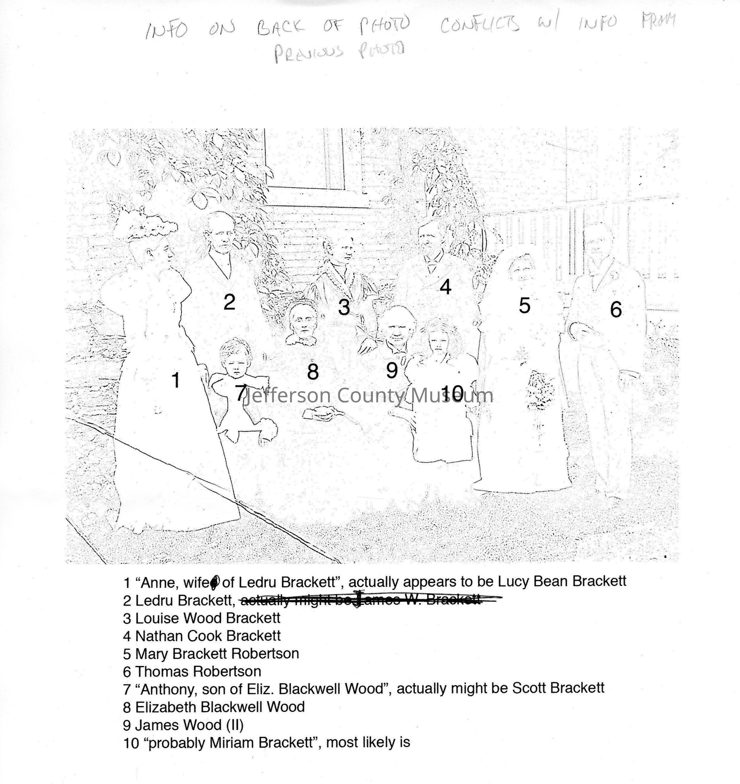 5) Photo: Wedding of Mary Brackett and Thomas Robertson Names from 7 below: Lucy Bean Brackett, Ledru Brackett, Louise Wood Brackett, Nathan Cook Brackett, Mary Brackett Robertson, Thomas Robertson, Scott Brackett (or Anthony Wood), Elizabeth Blackwell Wood, James Wood II, Miriam Brackett (perhaps) (IMG3273-5)