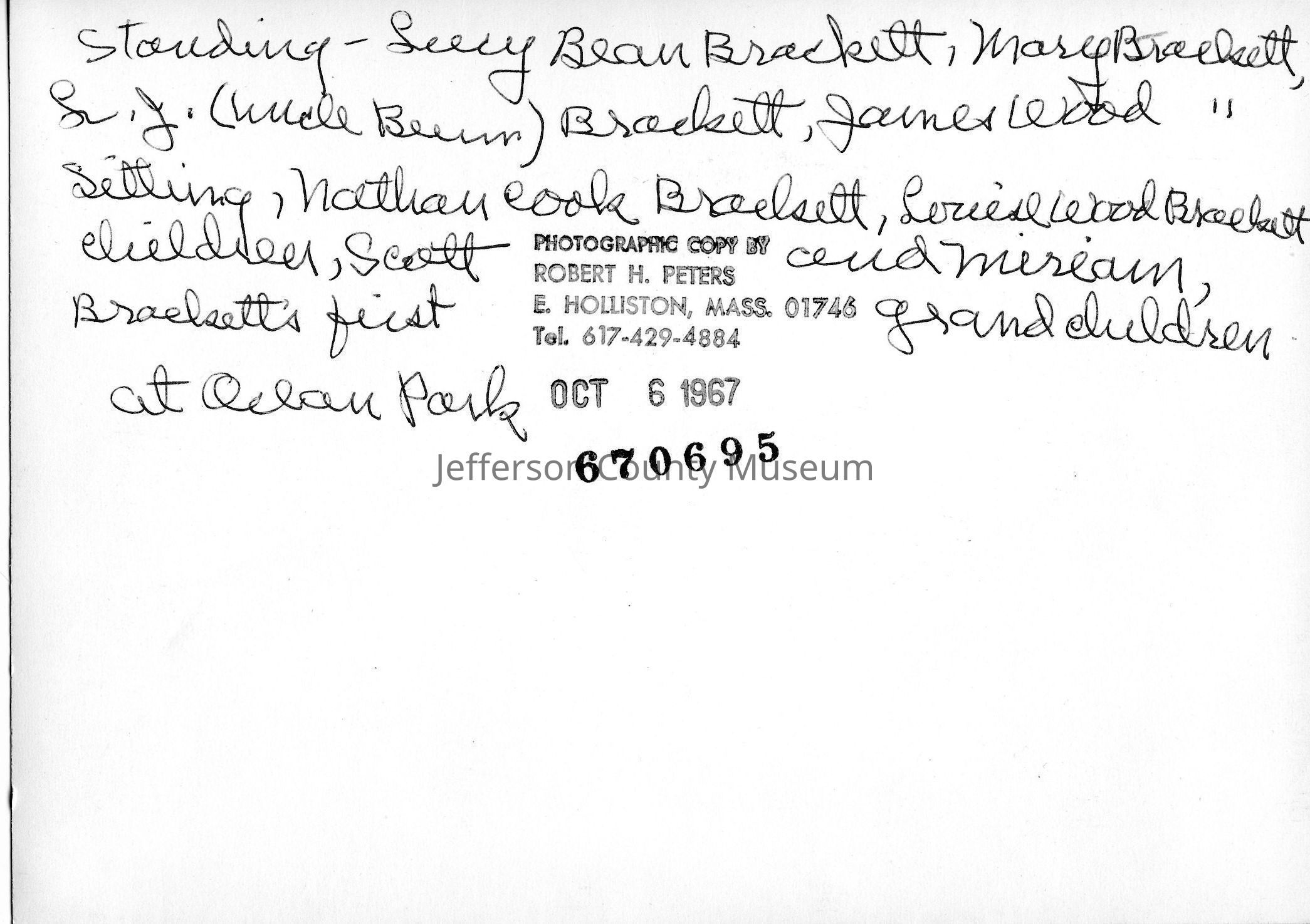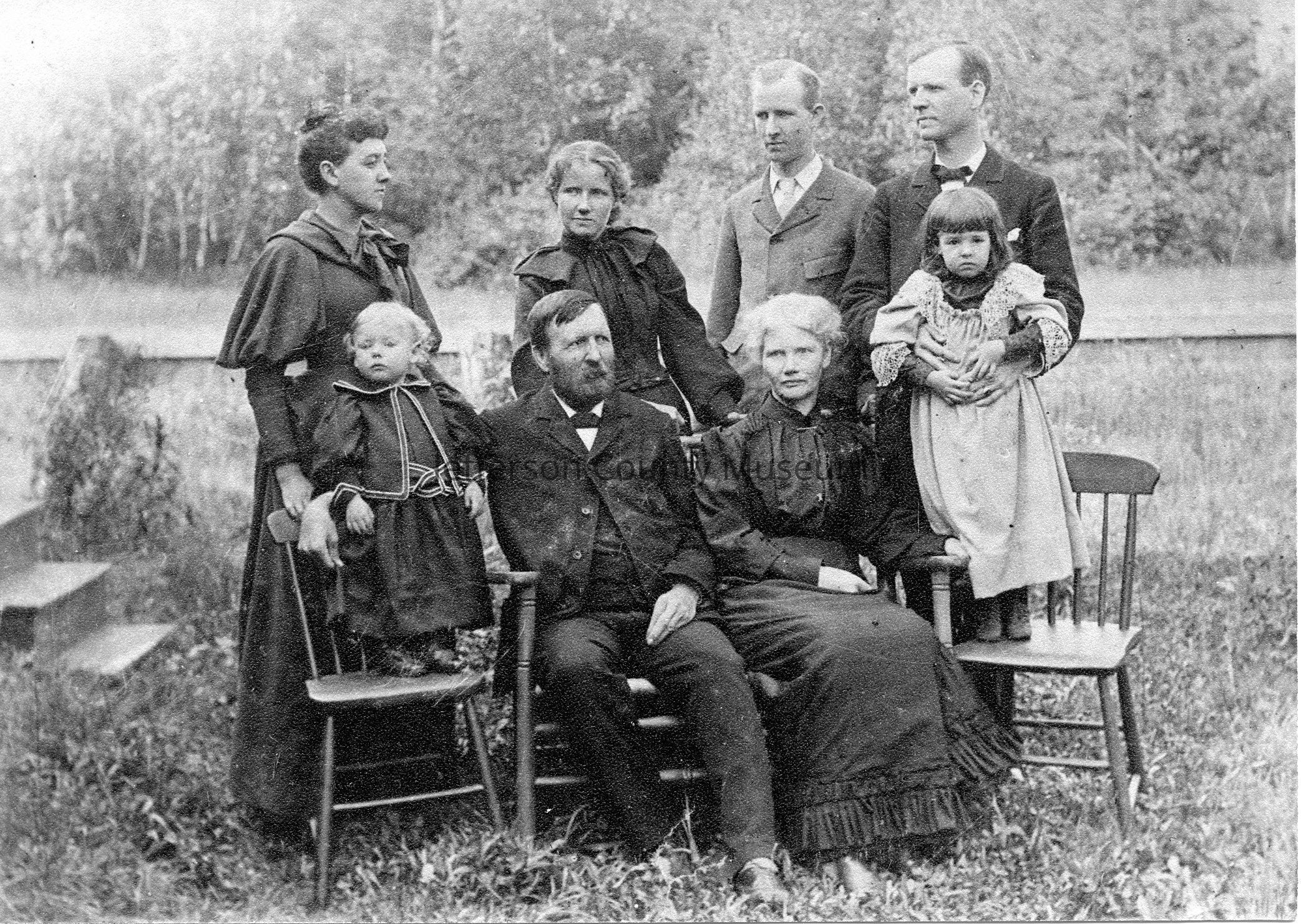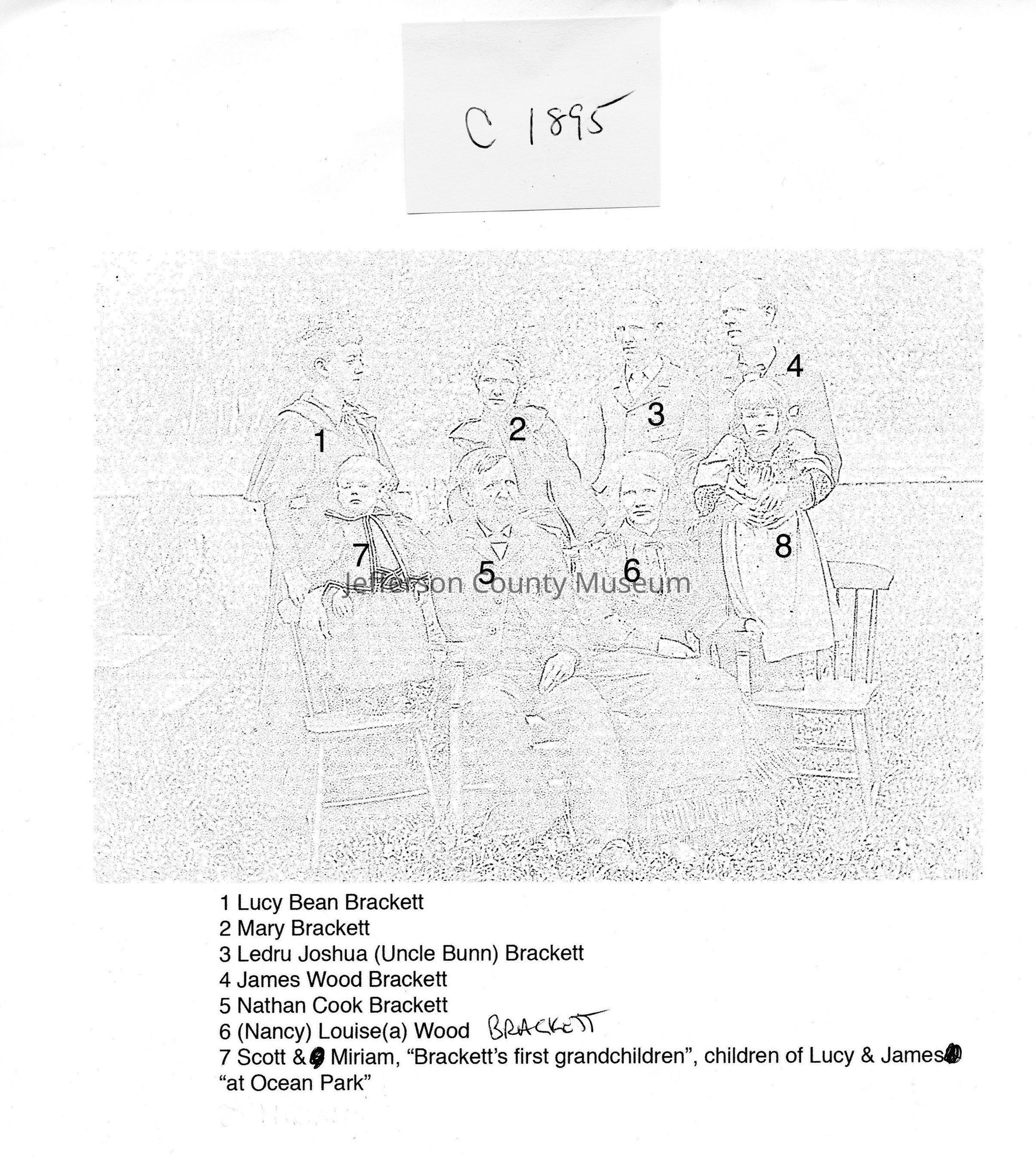 10) Photo: Family gathering, c 1895 Back row l to r: Lucy Bean Brackett, Mary Brackett, Ledru Joshua Brackett, James Wood Brackett; front row l to r: Scott Brackett, Louise Wood Brackett, Nathan Cook Brackett, Miriam Brackett (IMG3273-10)