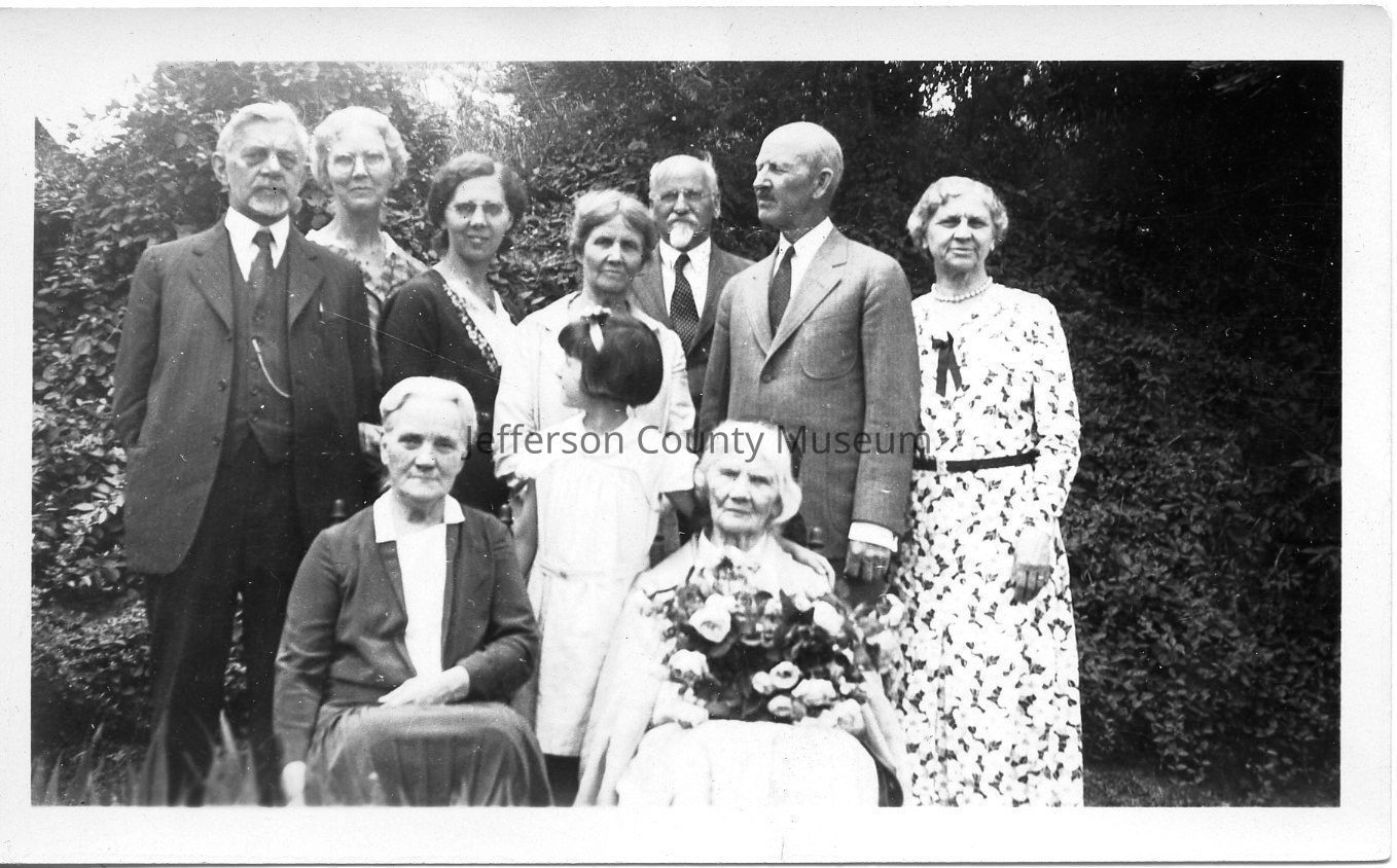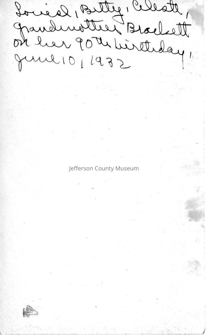 15) Photo: Louise Wood Brackett's 90th birthday celebration, June 10, 1932 Seated l to r: Anne Wood White (sister), Louise Wood Brackett; standing l to r: John Newcomer, Celeste Brackett Newcomer (daughter), Mary Louise Newcomer Moore (granddaughter), Mary Brackett Robertson (daughter), Elizabeth Laura Moore (great granddaughter), Thomas Robertson, Ledru Brackett (son), wife of Ledru (identified by donor) (IMG3273-15)