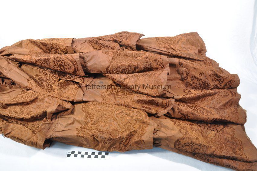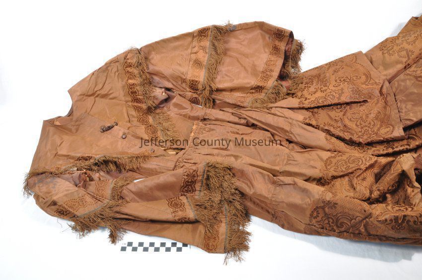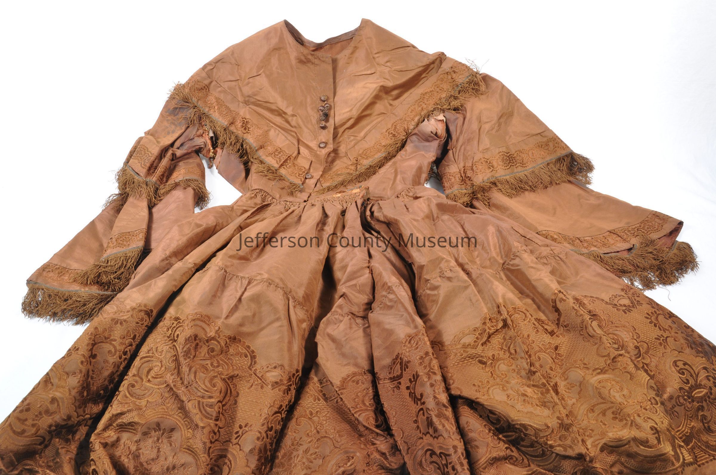 Brown silk brocade second day dress, high neck, no collar, V-shaped bertha on front, fringed with brown silk thread, same fringe on full-length sleeves, hooks and eyes close back with decorative cloth buttons added, three tiered skirt falling to full length and gathered at the waist.