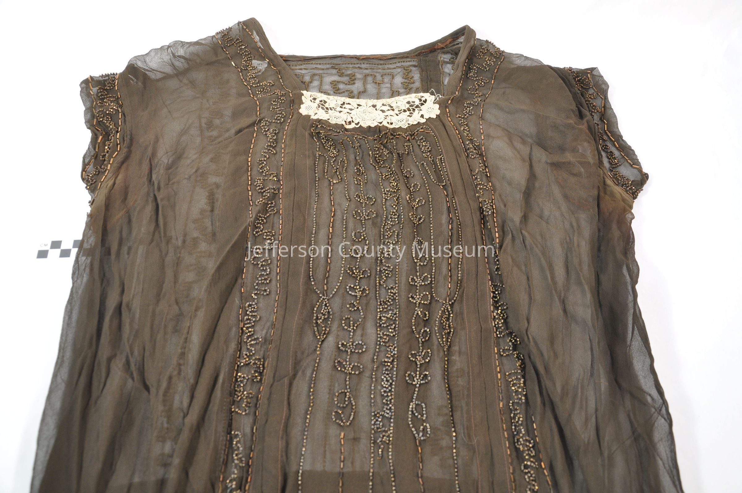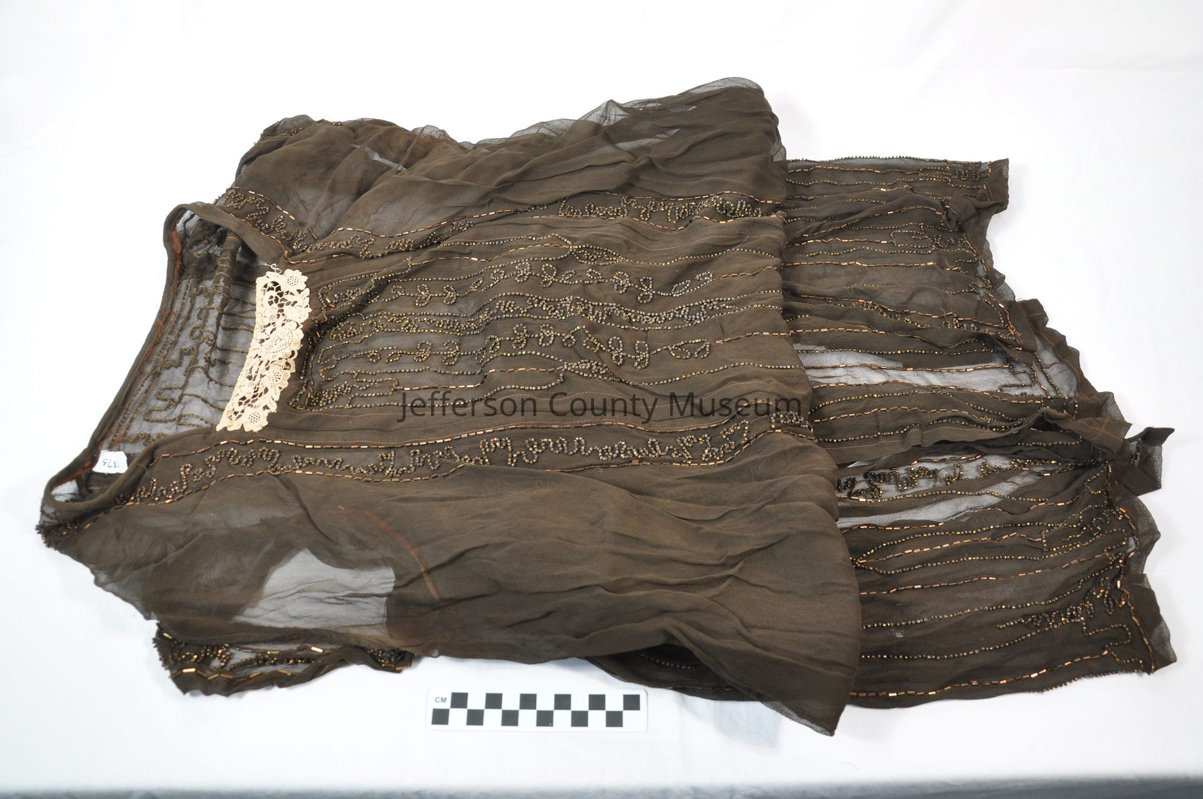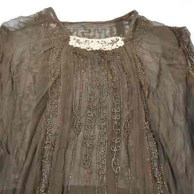 Brown chiffon beaded dress. Slit panels around bottom. Lace trim at front of neckline.