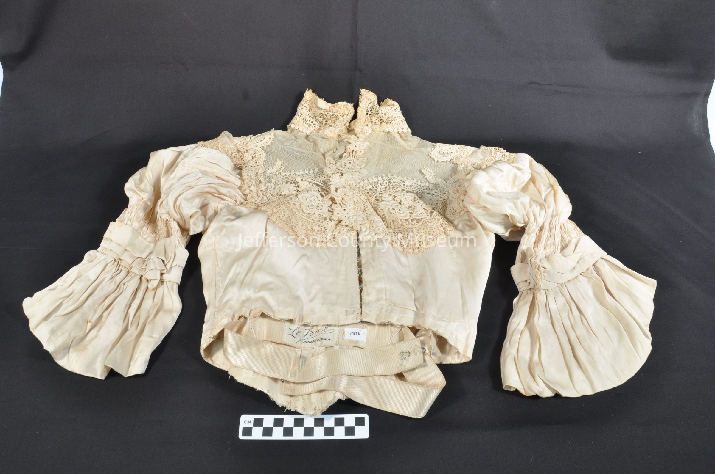 Cream colored satin blouse with applied embroidery on front and back. Hook and eye closures. Long sleeves are puffed at the shoulders but not leg-o-mutton. Cloth belt on inside with hook and eye closures. Stays around waist which is higher in front than back. Label on belt says "Le Fevre Philadelphia".Acquisition