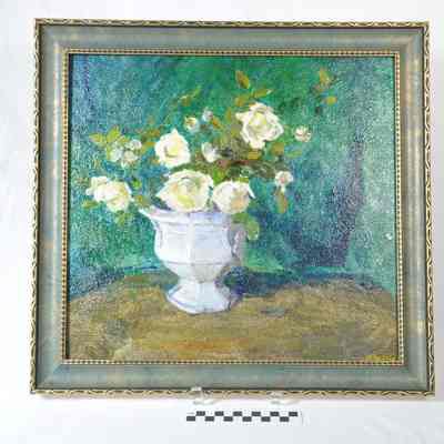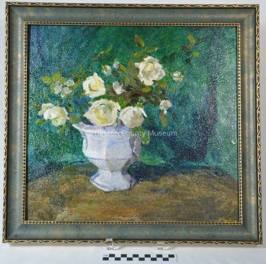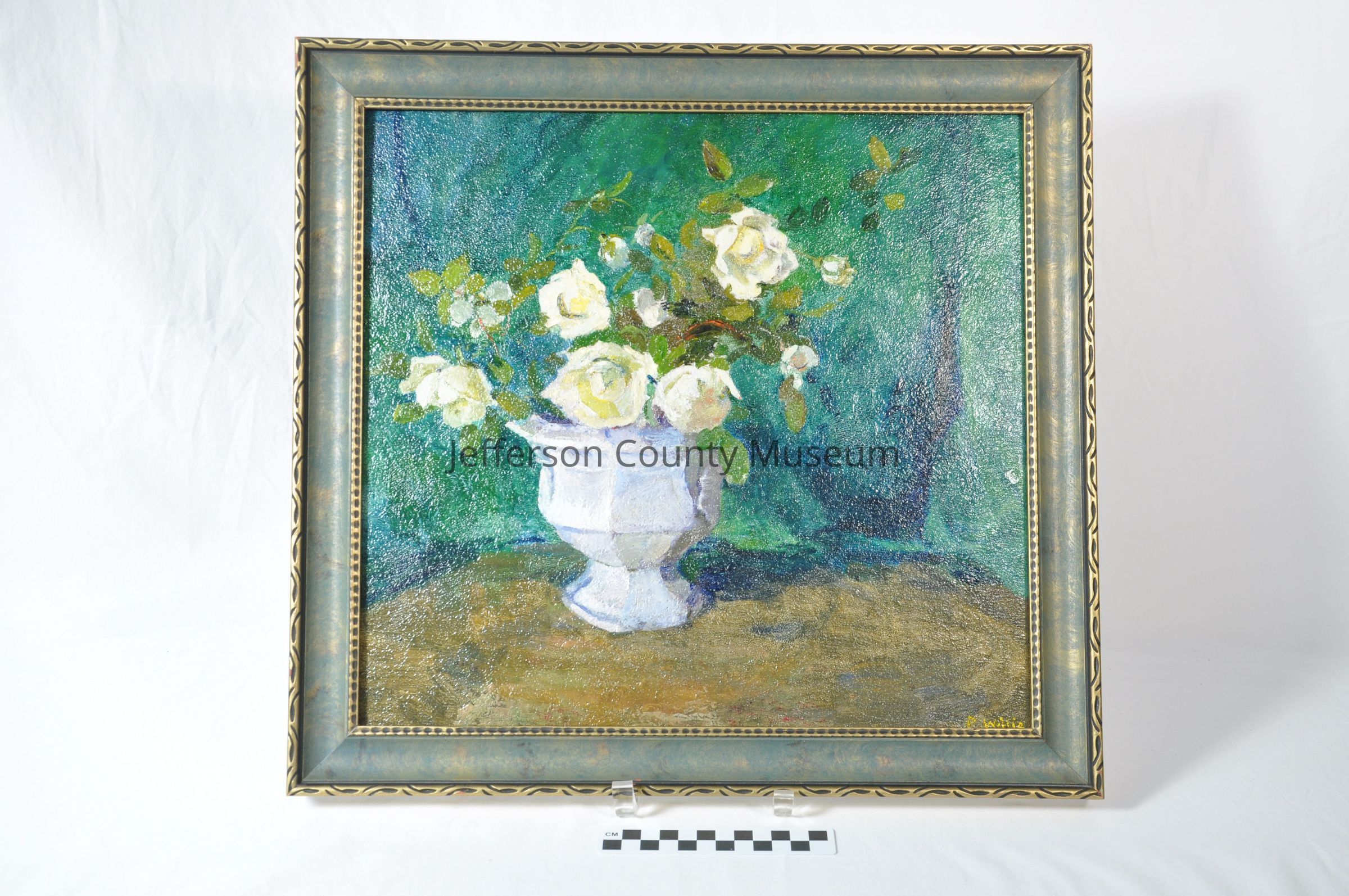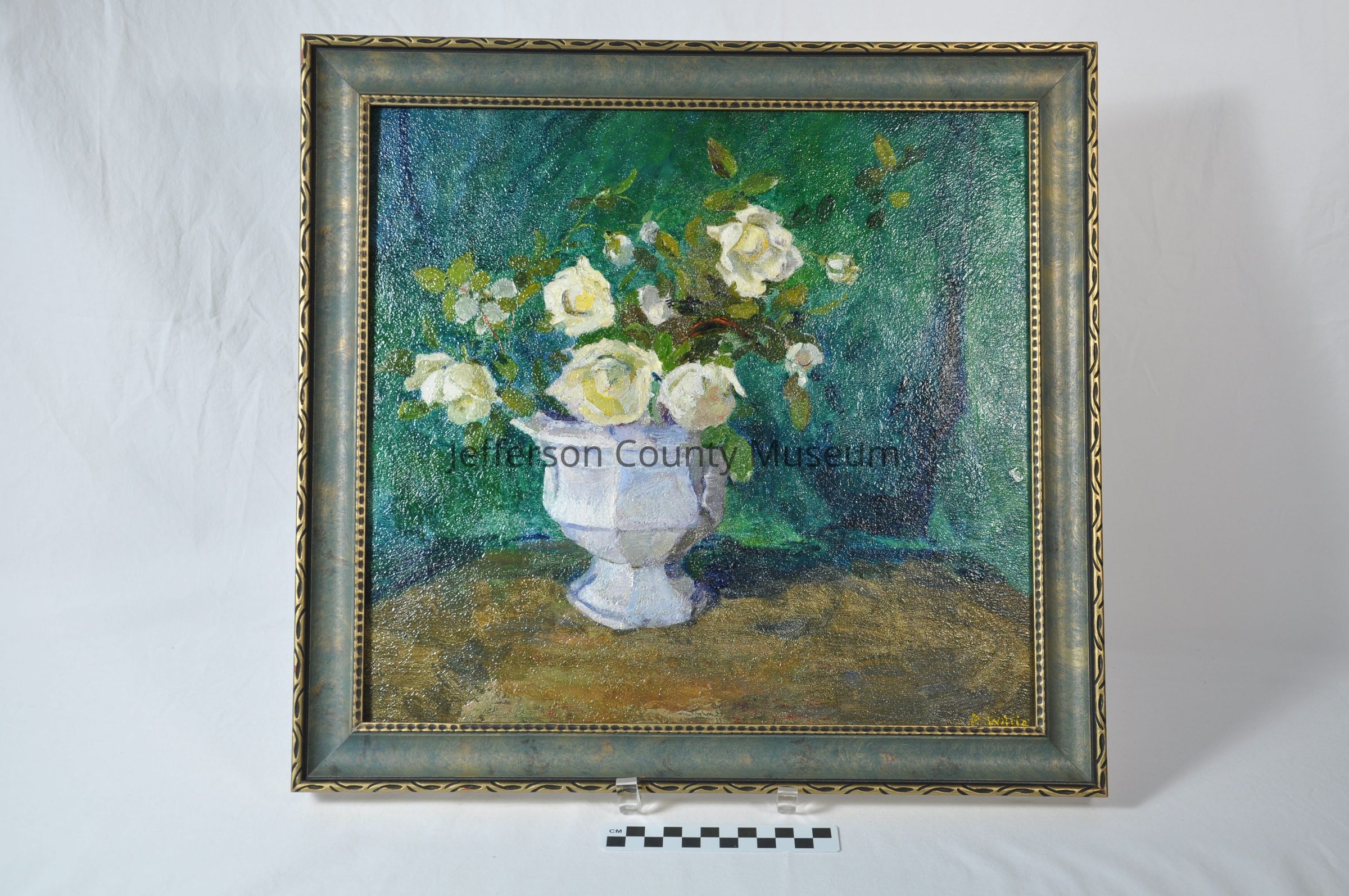Still life of white roses in a white urn or bowl, sitting on brownish-color table; green background. Framed in green and gilt wood frame. Painted by Patty Willis. Signature in yellow in lower right corner: "P Willis".