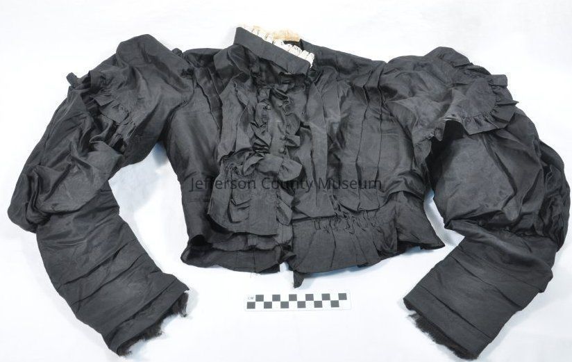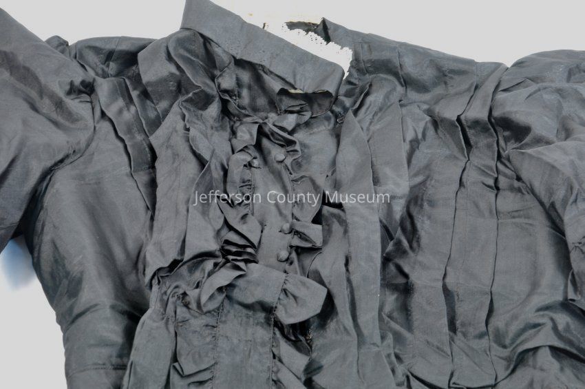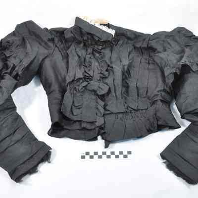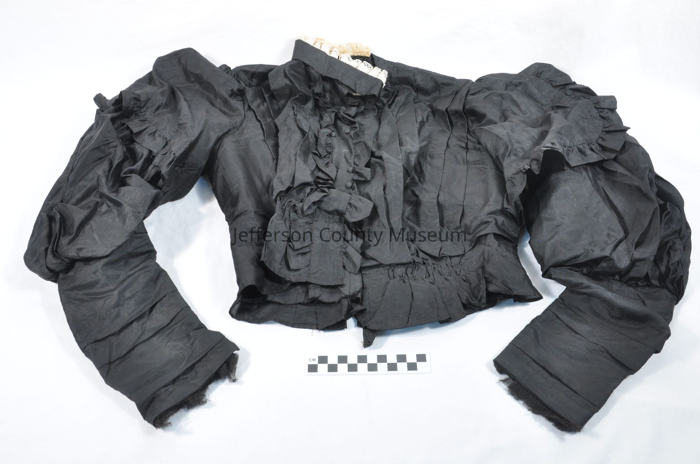 Black silk long-sleeved blouse with small lace or tatting trim around collar. Two rows of silk covered buttons down front. Also has hook and eye closures.Acquisition