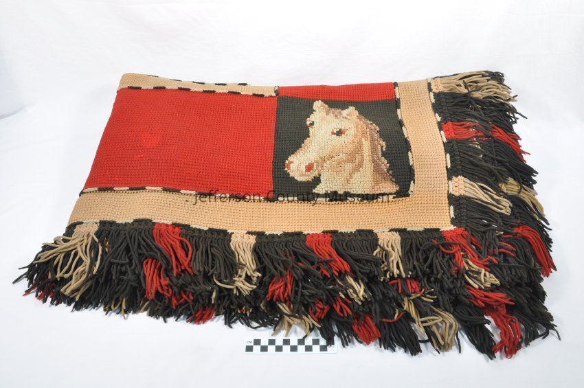 Heavy blanket of knitted wool for use in a carriage or buggy. Fringe all around. Colors are dark green, red, beige and brown. Has a horses head and wreath applied to the center dark green panel. The horse and wreath are made of a carpet like material. There is a deer head, a dog head, a fox head and a horse head in corners.Acquisition