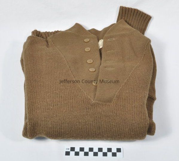 World War II pullover sweater with five buttons from neckline down to middle of the chest. Long sleeved, OD (olive drab) green in color. Label on inside of neck says "SWEATER, HIGH NECK SIZE: LARGE SENECA SWEATER CO. INC. P. O. 8371 Dated March 16, 1944 Spec. P.O.D. No. 111E Stock No. 55-S-34237 Phila. Q.M. Depot Inspector".Acquisition