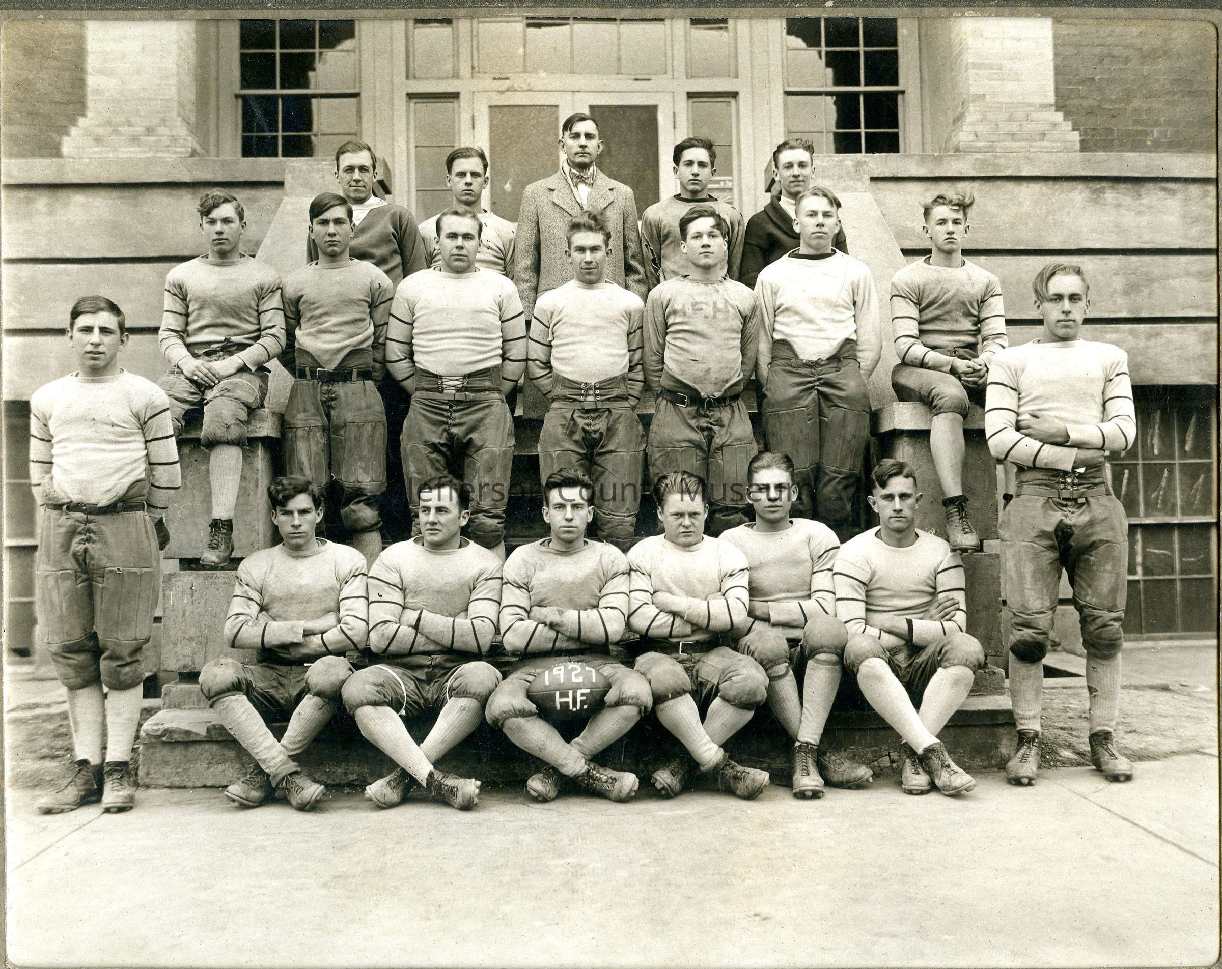 1927 Harpers Ferry High School football team taken on front steps of Harpers Ferry High School (now owned by National Park Service); fouter seated front-row player holds a football between his knees on which is written 1927 H.F