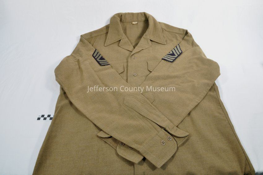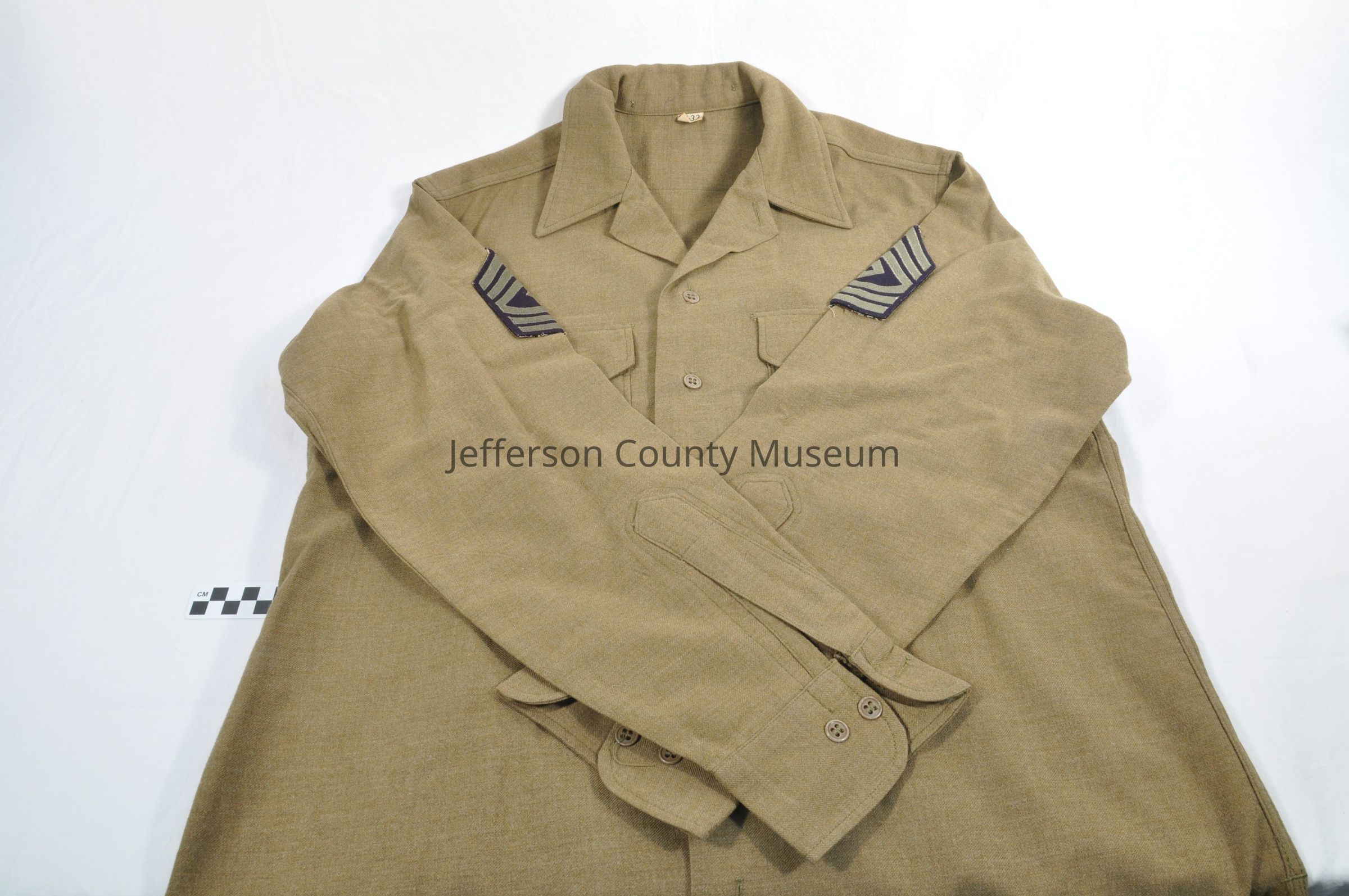 World War II OD (olive drab) brown long-sleeved winter uniform shirt with sergeant major stripes on the sleeves. Two flap pockets with buttons. Two buttons on cuffs. Label at collar is "15 - 33". And an additional laundry tag stapled to inside bottom says "N335-8". The date on the specification label is June 7, 1943.Acquisition