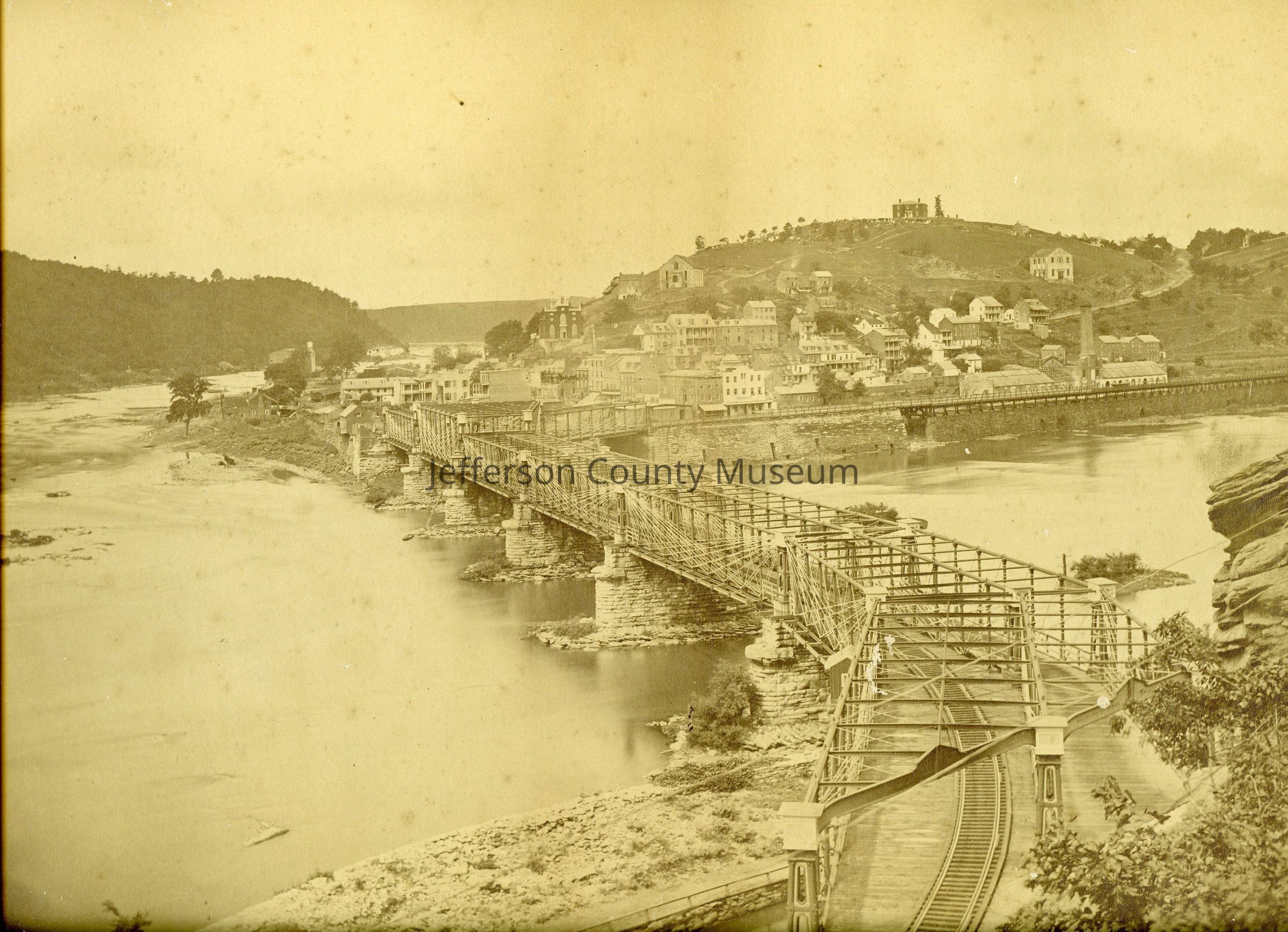 Harpers Ferry, from Maryland Heights. Shows railroad bridge that was washed out in the 1936 flood. Photo dates from late 1870s to early 1880s -- taken prior to building of wagon bridge over the Shenandoah (1883), there had been no renovations to St. Peter's Catholic Church (1896), the Lockwood House had only two floors, and there was no tunnel.Acquisition