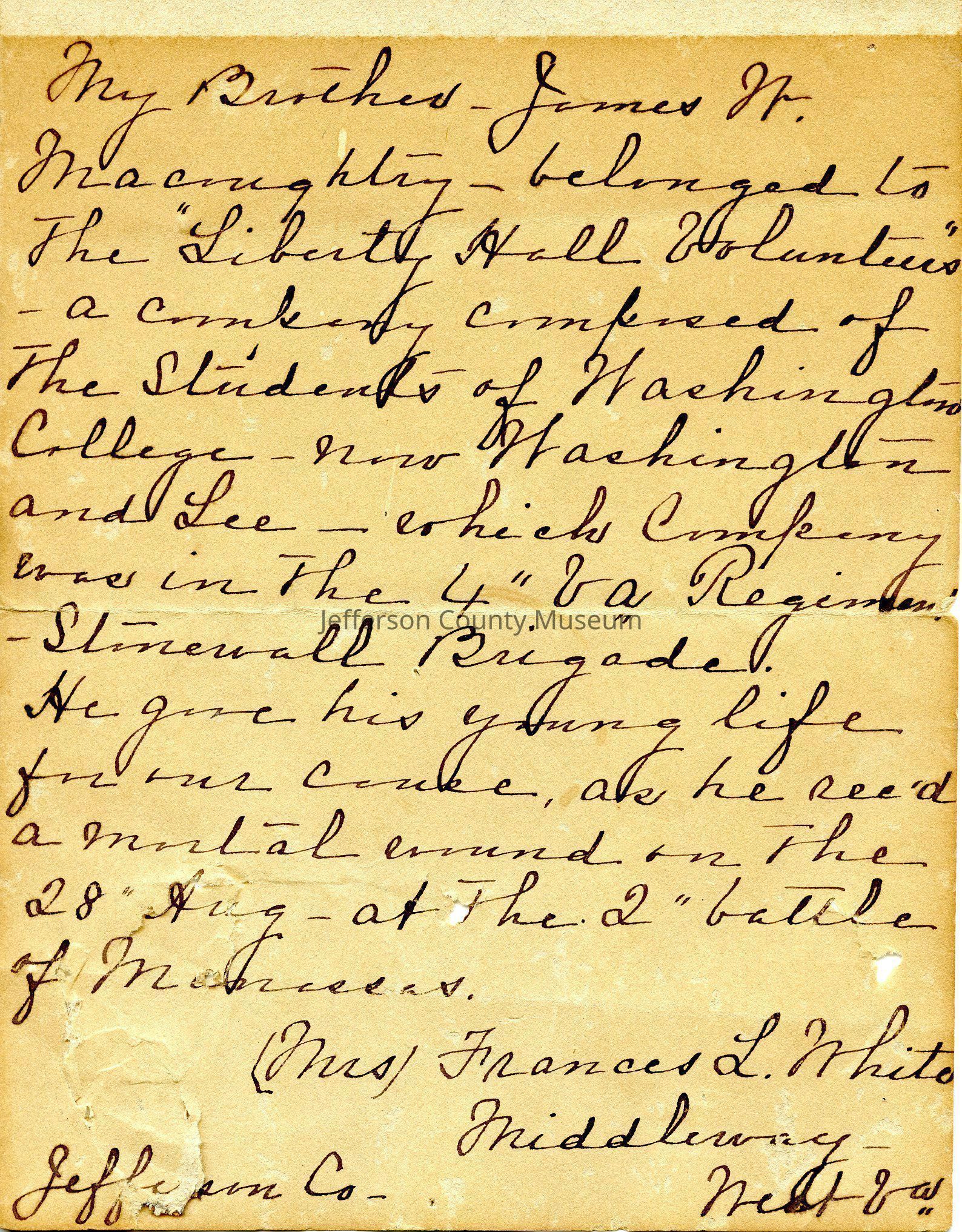 Handwritten note glued to the wood backing of frame of painted overlay (IMG819) of James W. Macoughtry reads: My Brother - James W. Macoughtry - belonged to The Liberty Hall Volunteers - a company composed of The Students of Washington College - now Washington and Lee - which Company was in The 4" Va Regiment - Stonewall Brigade. He gave his young life for our cause, as he rec'd a mortal wound on The 28" Aug - at The 2" battle of Manassas. [signed] (Mrs.) Frances L White, Middleway, Jefferson Co - West VaAcquisition