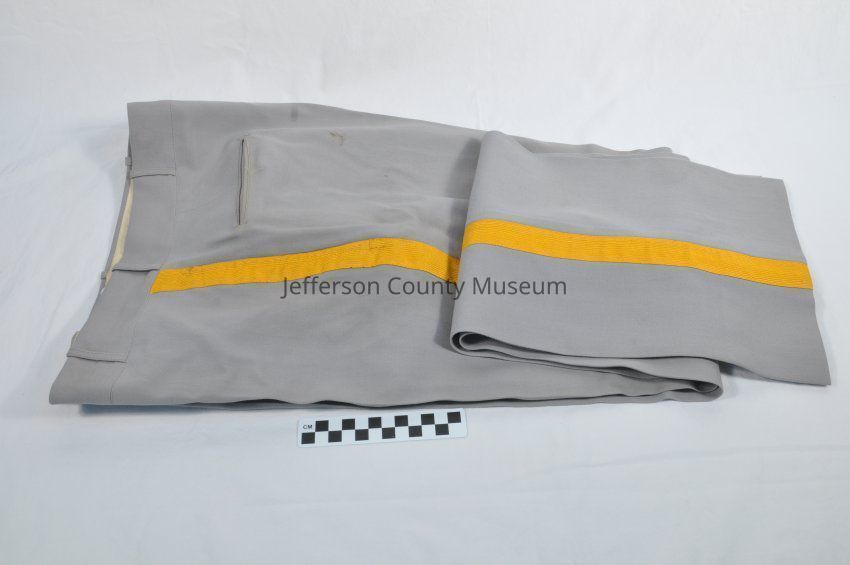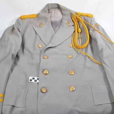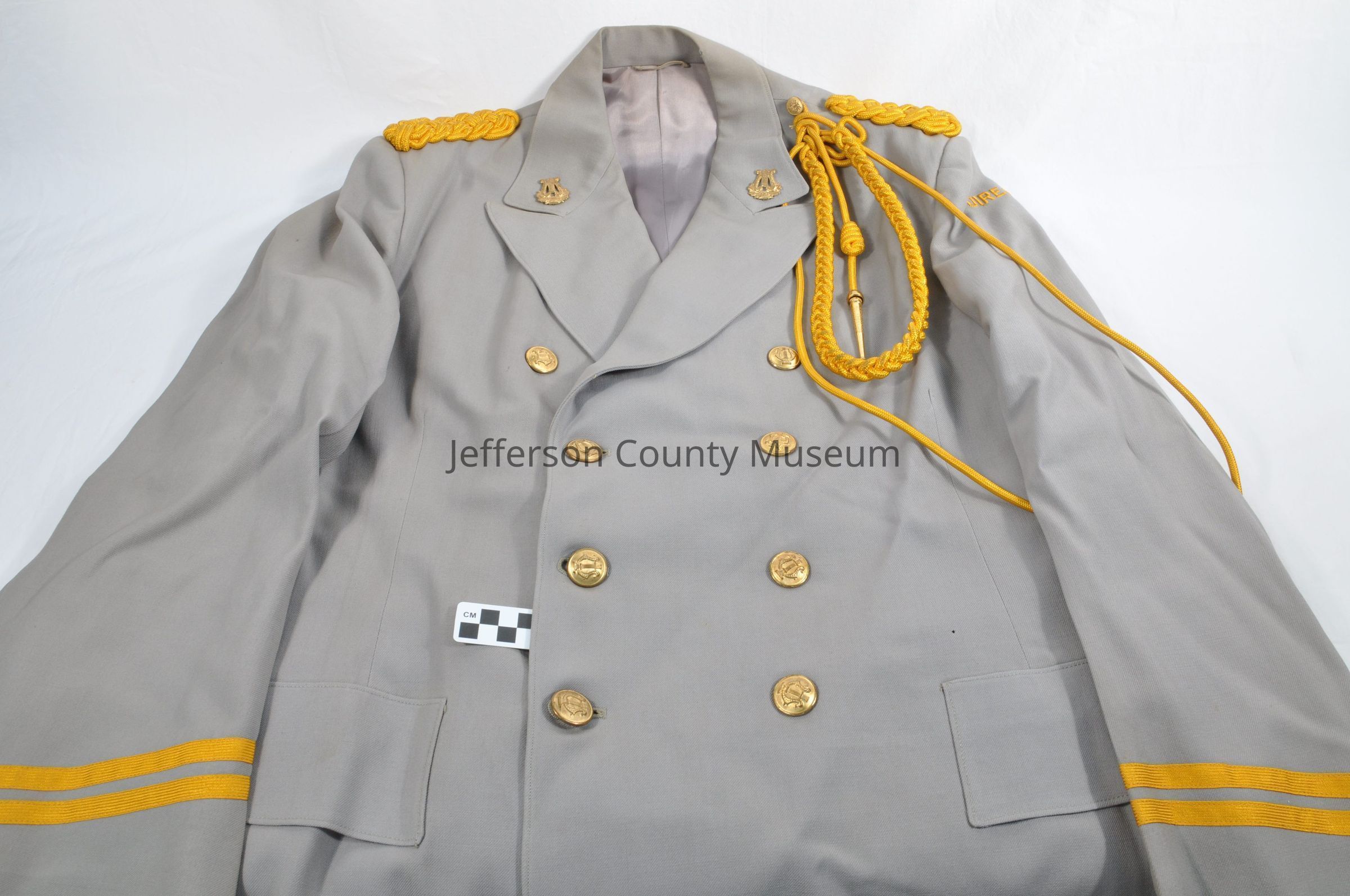 Appleland Band director's uniform of light gray wool consists of tunic (a) and trousers (b), ca 1960 to 1970. The tunic has gold braided epaulets and a long gold braid on the left shoulder. The end of the braid has a fire hose nozzle type piece at the end. There are brass lyre insignia on the lapels and eight brass buttons with lyres. At the top of the left sleeve on the shoulder in gold is DIRECTOR". At the ends of the sleeves are two gold stripes. Trousers have one gold stripe down each side. Inside trousers on left pocket is tag that says "100% Wool 'UNIFORMS BY OSWALD,' Inc." Also has a size chart, at the bottom is handwritten name of "Chet Hunter".Acquisition