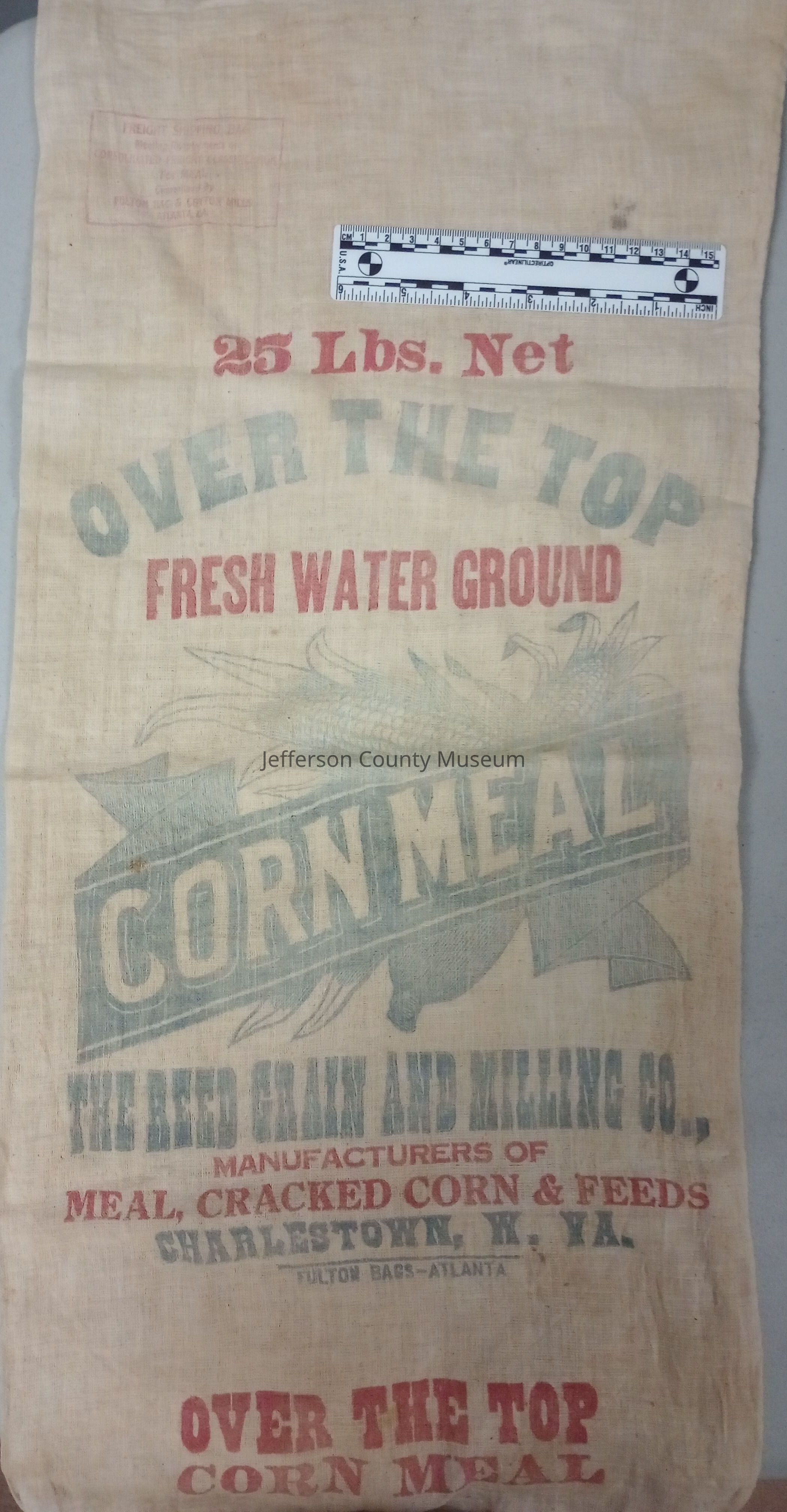 Cloth sack from the Reed Grain and Milling Co. In red and blue letters with a graphic of corn on the front, it says "25 Lbs. Net/ Over the Top/ Fresh Water Ground/ Corn Meal/ The Reed Grain and Milling Co.,/ Manufacturers of/ Meal, Cracked Corn & Feeds/ Charlestown, W. VA./ Fulton Bags-Atlanta/ Over the Top Corn Meal."
