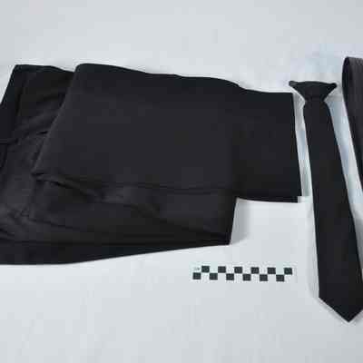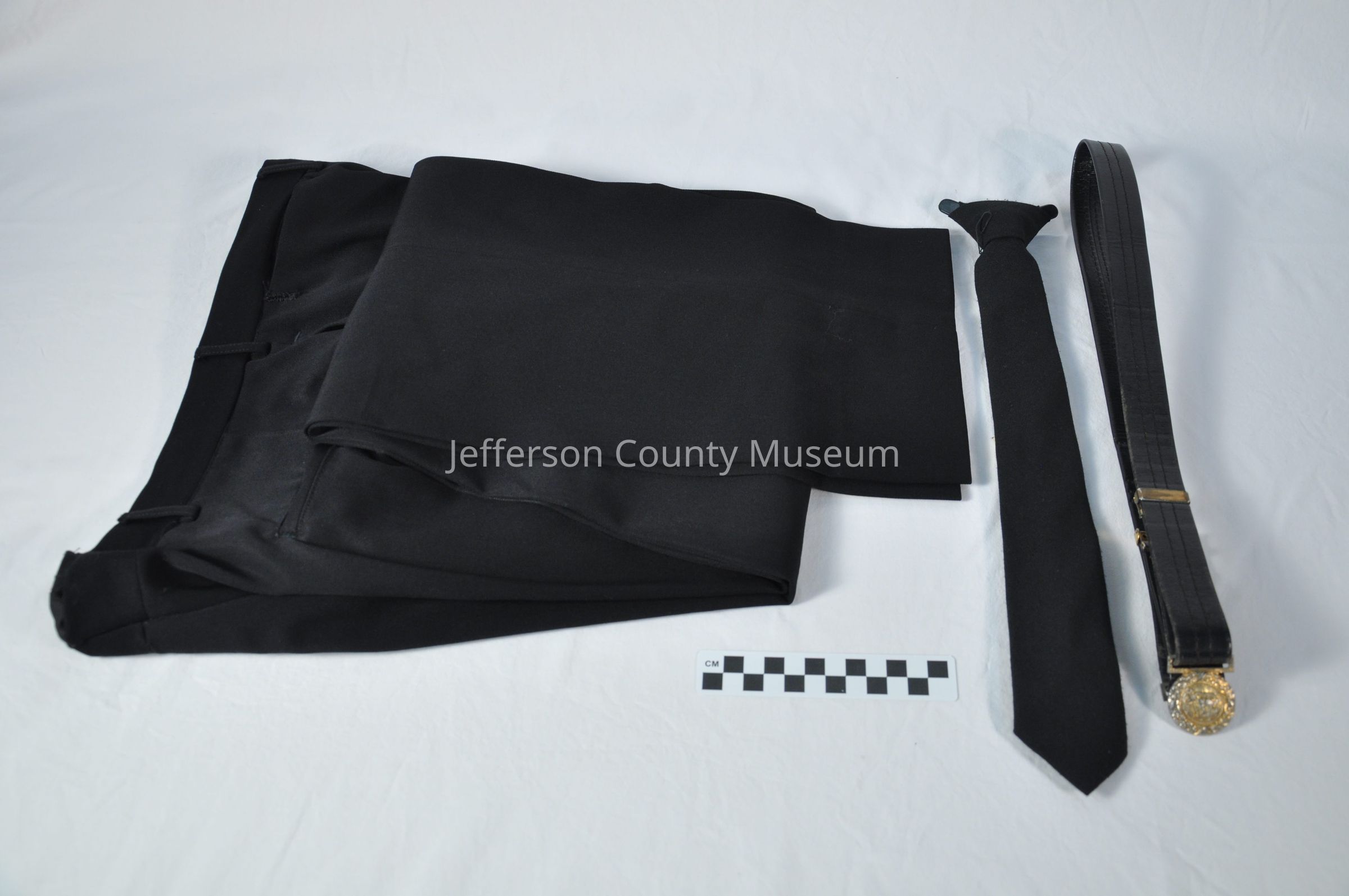 Thomas Hahn's Navy blue formal dress uniform. Short jacket has four captain's stripes at the cuffs with a star above. Jacket has six gold buttons with spread-winged eagle standing on an anchor. However, the jacket is held closed with a chain like a pocket watch chain on the inside of the front. There are eleven medals pinned to the left breast area. These are smaller versions of the full-size medals normally worn on a non-formal uniform. Inside the jacket is a label that says "WORLD FAMOUS Novakoff Bros. UNIFORMS BOSTON". Trousers have zipper fly and belt loops. Inside on the left waistband is a white label. On it is "NAVAL UNIFORM SHOP BROOKLYN 32 NEW YORK Name T.F. HAHN Rank CAPT Corps USN.............". Leather belt with brass adjustment keepers for size and round buckle with navy emblem of spread-winged eagle standing on an anchor surrounded by a wreath. Also includes a clip-on long tie.Acquisition