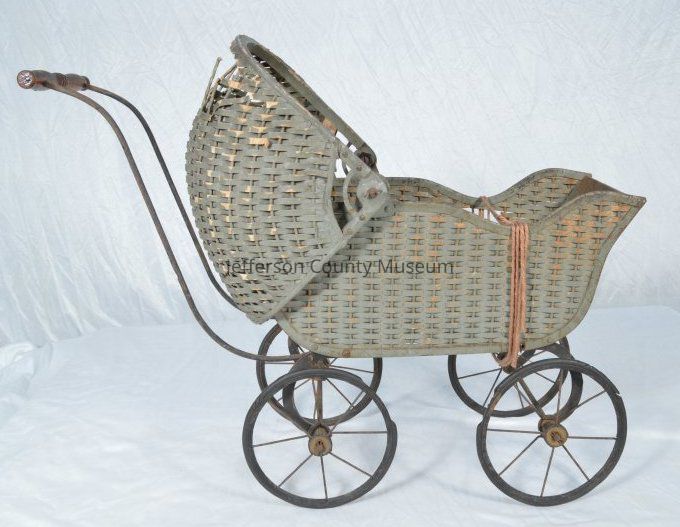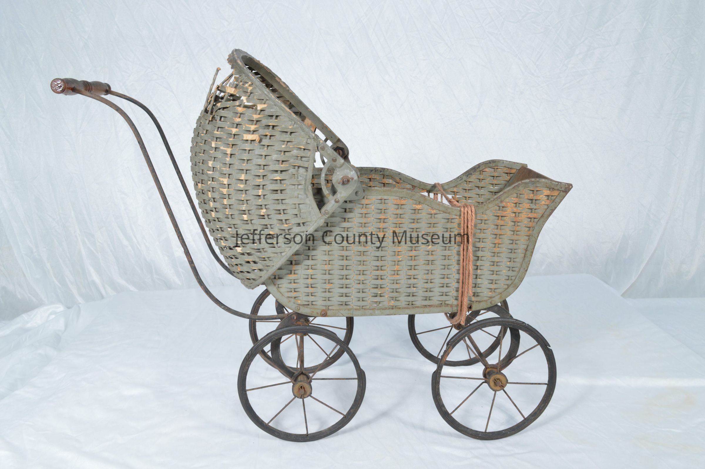 Carriage made of woven pressed paper painted green. Wood push handle with two curved metal rods. Four tires with thin metal spokes around outside. Has top that swivel back and forth for shade. Tin bottom to hold doll.