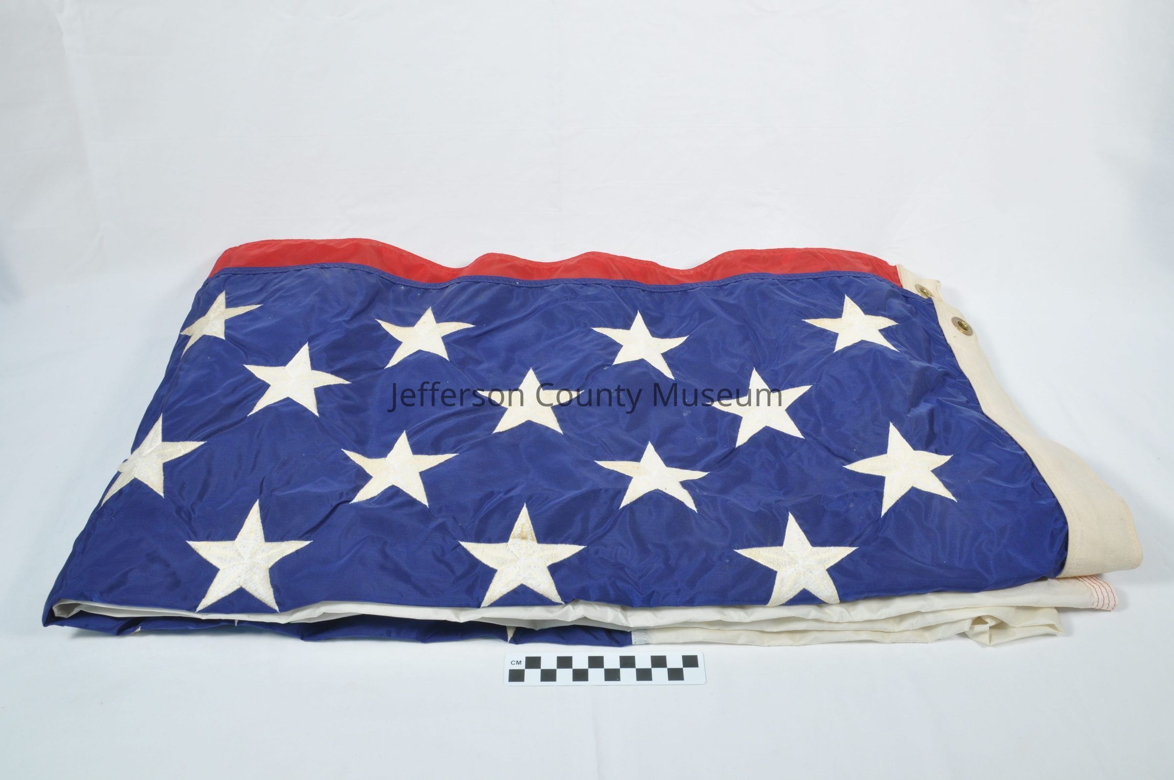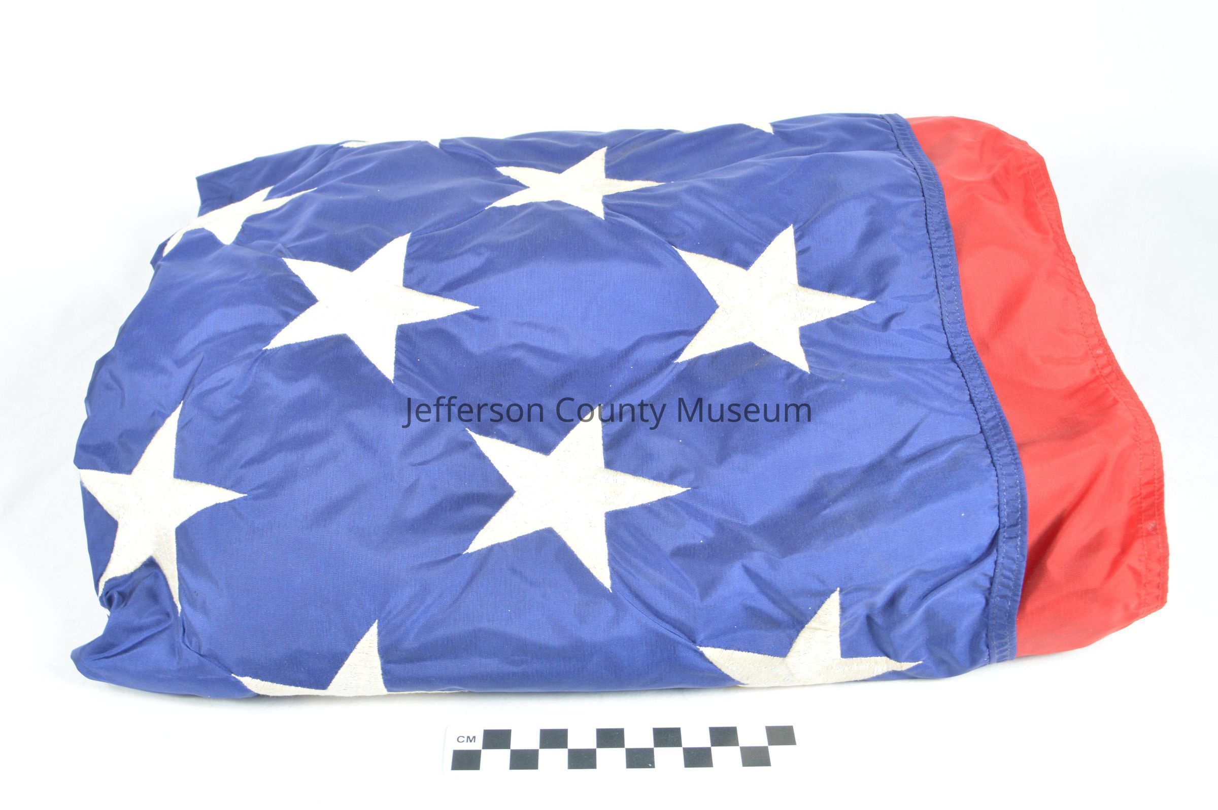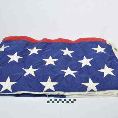 U. S. flag flown at the Tomb of the Unknowns. Stamped on end "FLAG, NAT'L. USA GS-07F-86220 8345-00-753-3235 5' x 9' 6" ANNIN & CO. U.S. PROPERTY". Flag has framed certificate with it. On the certificate is a depiction of the Tomb of the Unknowns with a soldier marching in front of it. On either side are American flags. The certificates reads "ARLINGTON NATIONAL CEMETERY THE FLAG of the UNITED STATES OF AMERICA WAS FLOWN OVER THE TOMB OF THE UNKNOWNS IN HONOR OF HARPERS FERRY BOLIVAR DISTRICT VETERANS 23 May 1996 DATE (signed) JOHN C. METZLER, JR. Superintendent".Acquisition