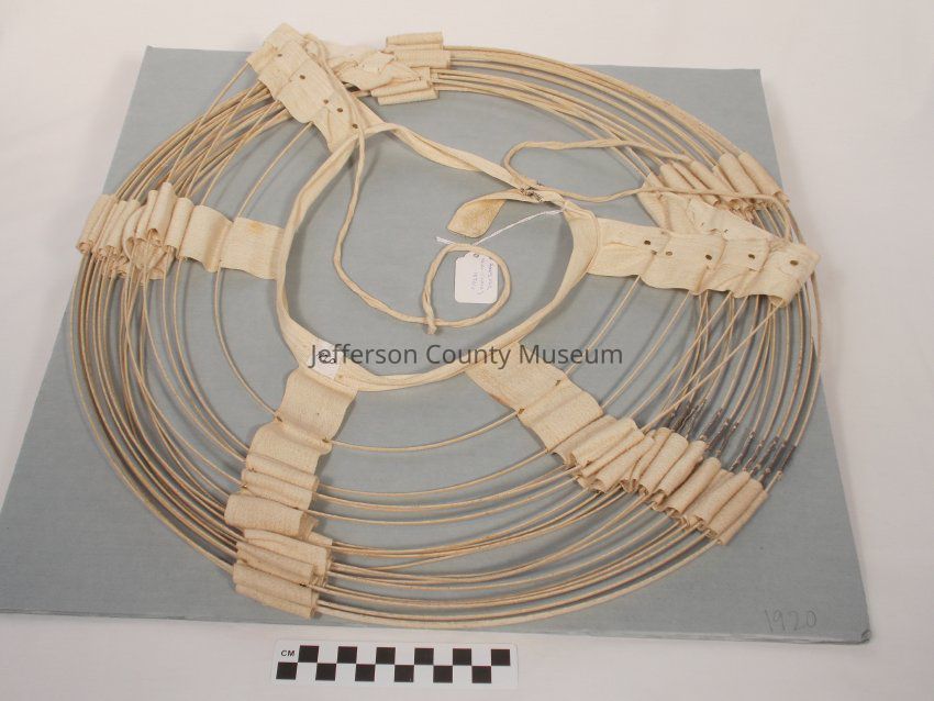 Hoops for under a long skirt or dress. Hoops are wire covered with fabric. The hoops are held together with five bands of cotton and round metal tabs. At the top is a cotton belt and metal buckle with pin type keepers. There is also a string tie.Acquisition