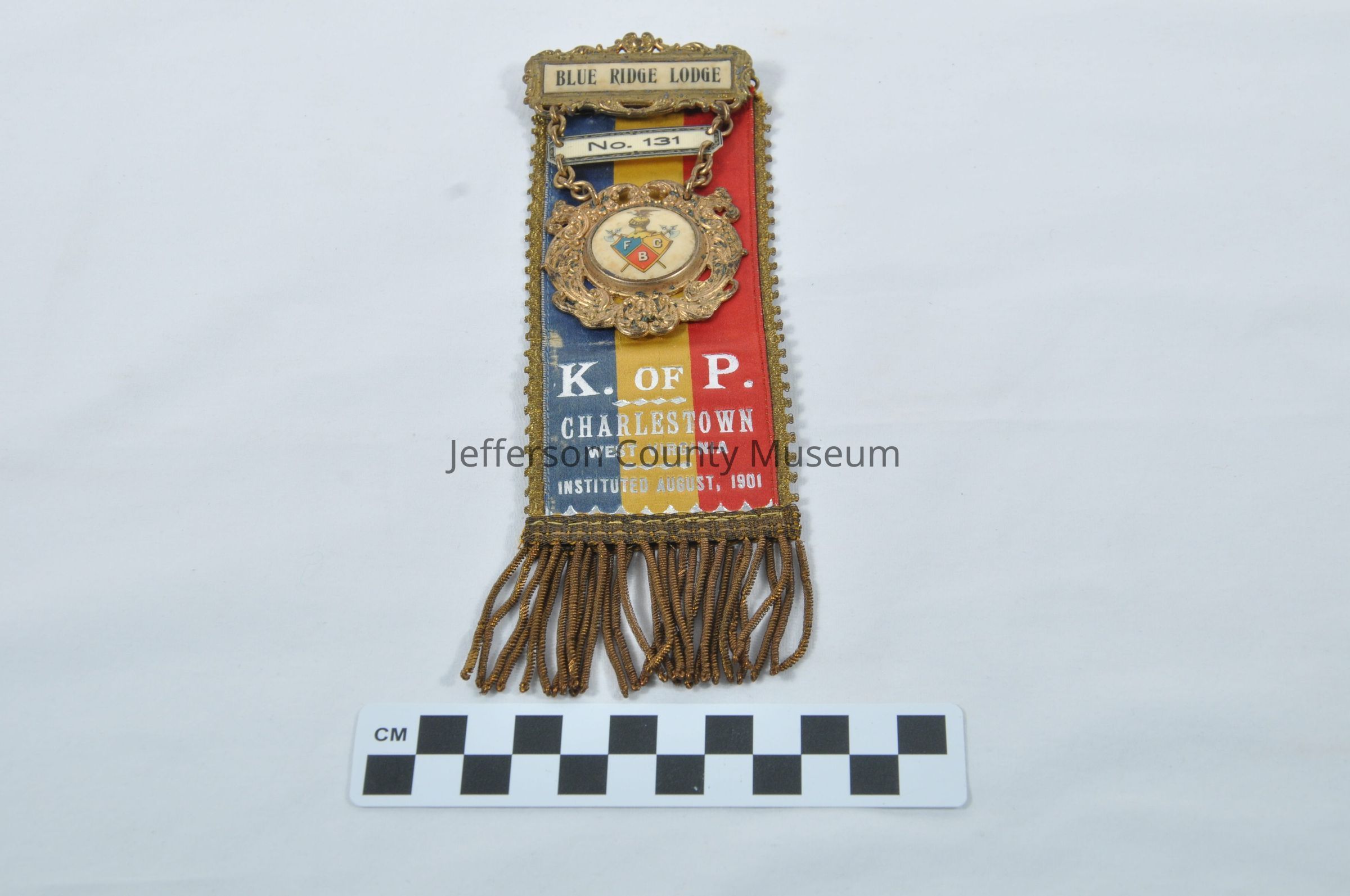 Two sided ribbon. On front is rectangular name bar at top with "BLUE RIDGE LODGE". Below attached with a brass link of chain is "No. 131" Below that, attached with three links of brass chain is a medallion with a white piece of porcelain in center. On the porcelain is a gold, blue, yellow and red coat of arms. The letters on the shield are "F B C". On the blue, yellow and red ribbon in silver is "K. OF P. CHARLESTOWN WEST VIRGINIA INSTITUTED AUGUST, 1901" The back of the ribbon is black with "K. OF P. CHARLESTOWN WEST VIRGINIA INSTITUTED AUGUST, 1901". At the bottom of the ribbon is brass wire fringe.Acquisition