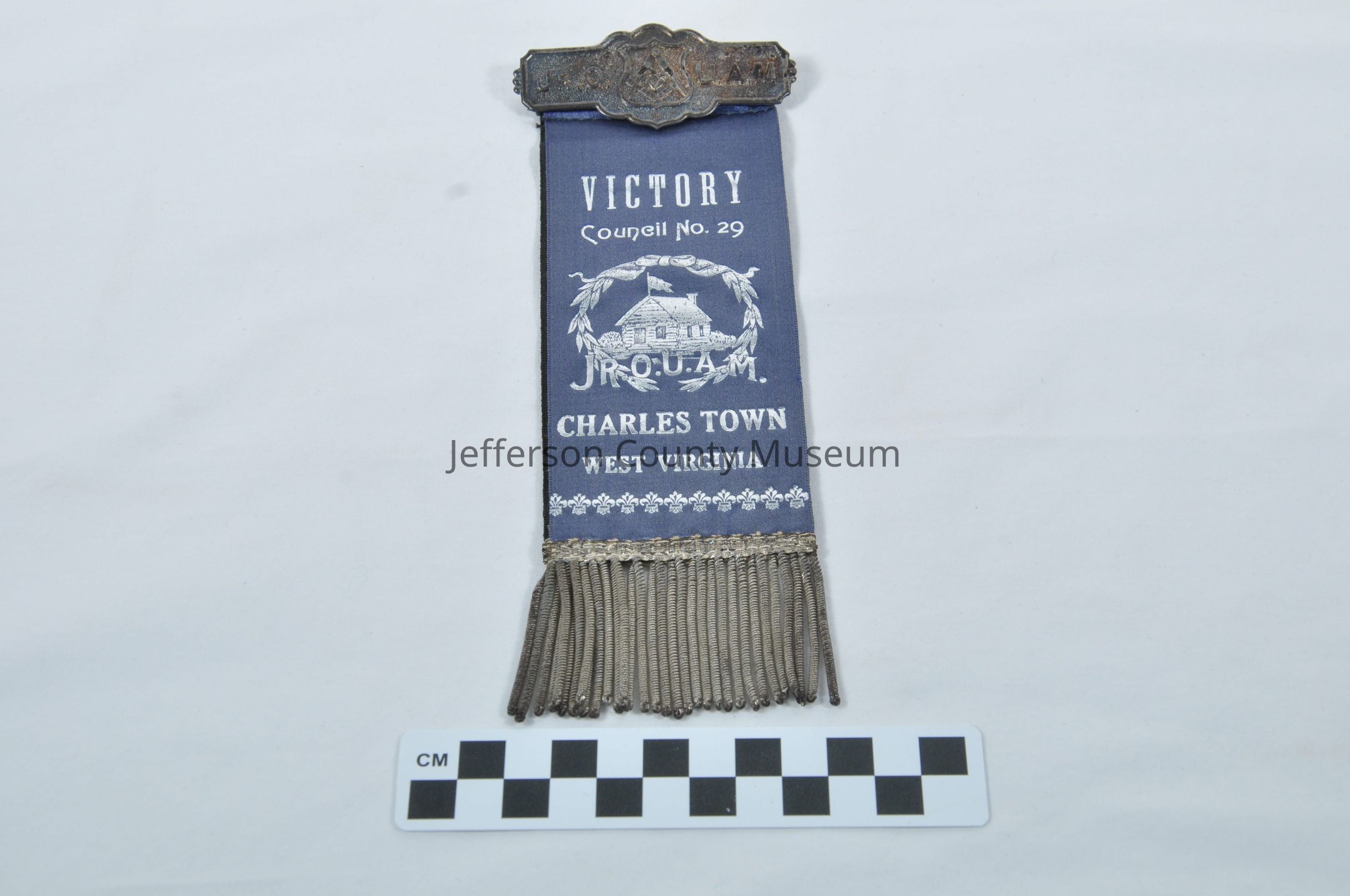 Two-sided ribbon with tin nameplate at top. On plate is "Jr. O." (the Masonic symbol) and "U. A. M." On blue ribbon in silver is "VICTORY COUNCIL NO. 29". In the center is a log cabin with a flag on top surrounded by a wreath. At the bottom of the wreath is "JR. OU.A.M. CHARLES TOWN WEST VIRGINIA". On back is a black ribbon with the following in silver: "In Memoriam VICTORY COUNCIL NO. 29". The same cabin with flag surrounded by a wreath, and below "JR. O.U.A.M. CHARLES TOWN WEST VIRGINIA. At bottom of ribbon is silver wire fringe.Acquisition