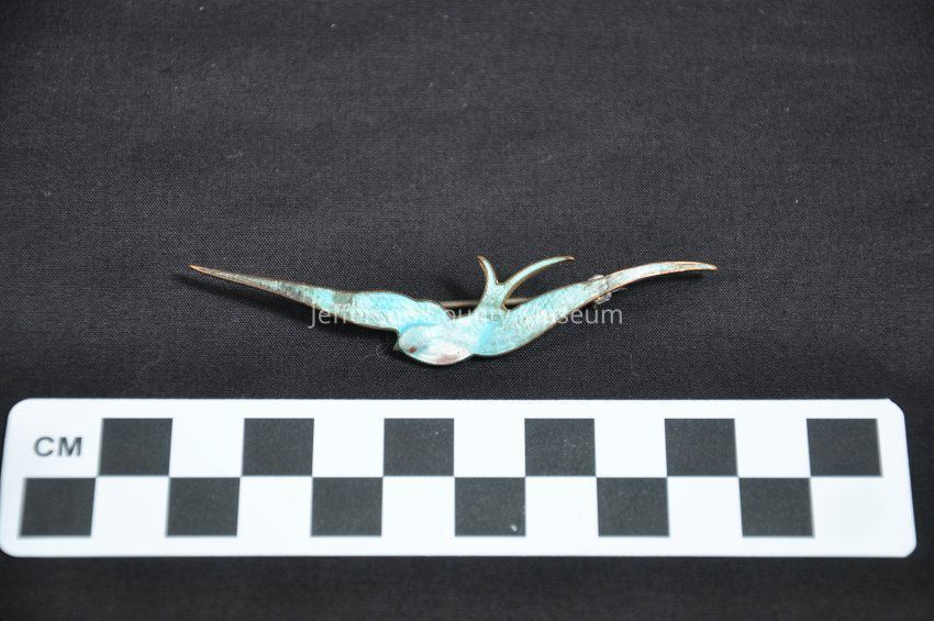 Pin in shape of a bird with light blue body and white under belly. Pin and clasp keeper on back.