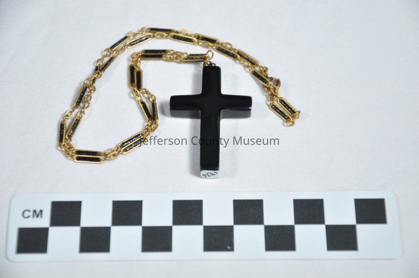 Necklace with black plastic cross. Chain is black and gold. This is similar to catalog number 1928 except chain is intact.Acquisition