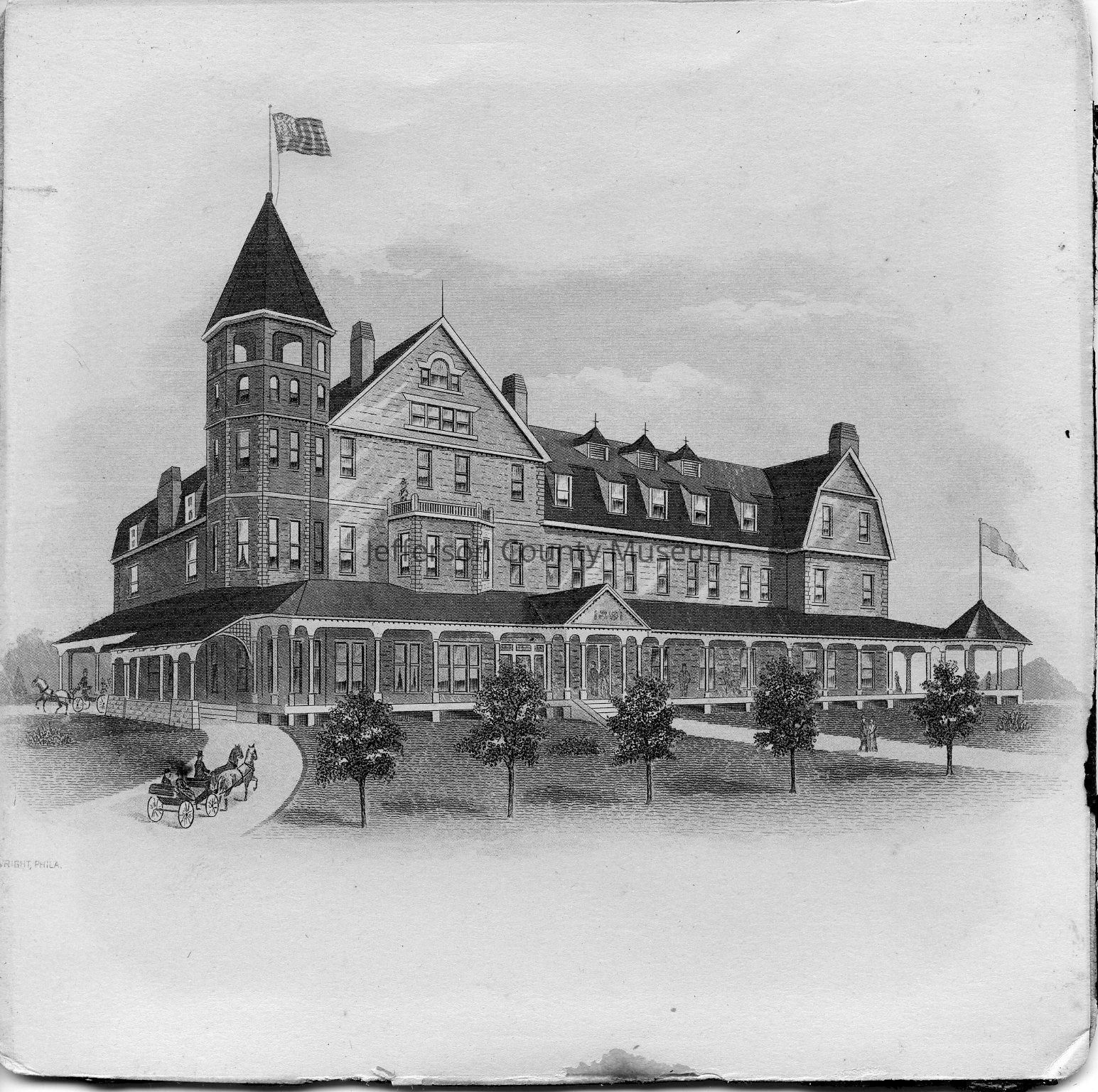 Powhatan Hotel. Artist was Wright, Philadelphia. Glued to cardstock. The Powhatan Hotel was built in 1892 on the lot where the old Jefferson Memorial Hospital was located on 3rd Avenue in Ranson. It later became the Powhatan College for Young Women and then St. Hilda's Hall, a school for girls.