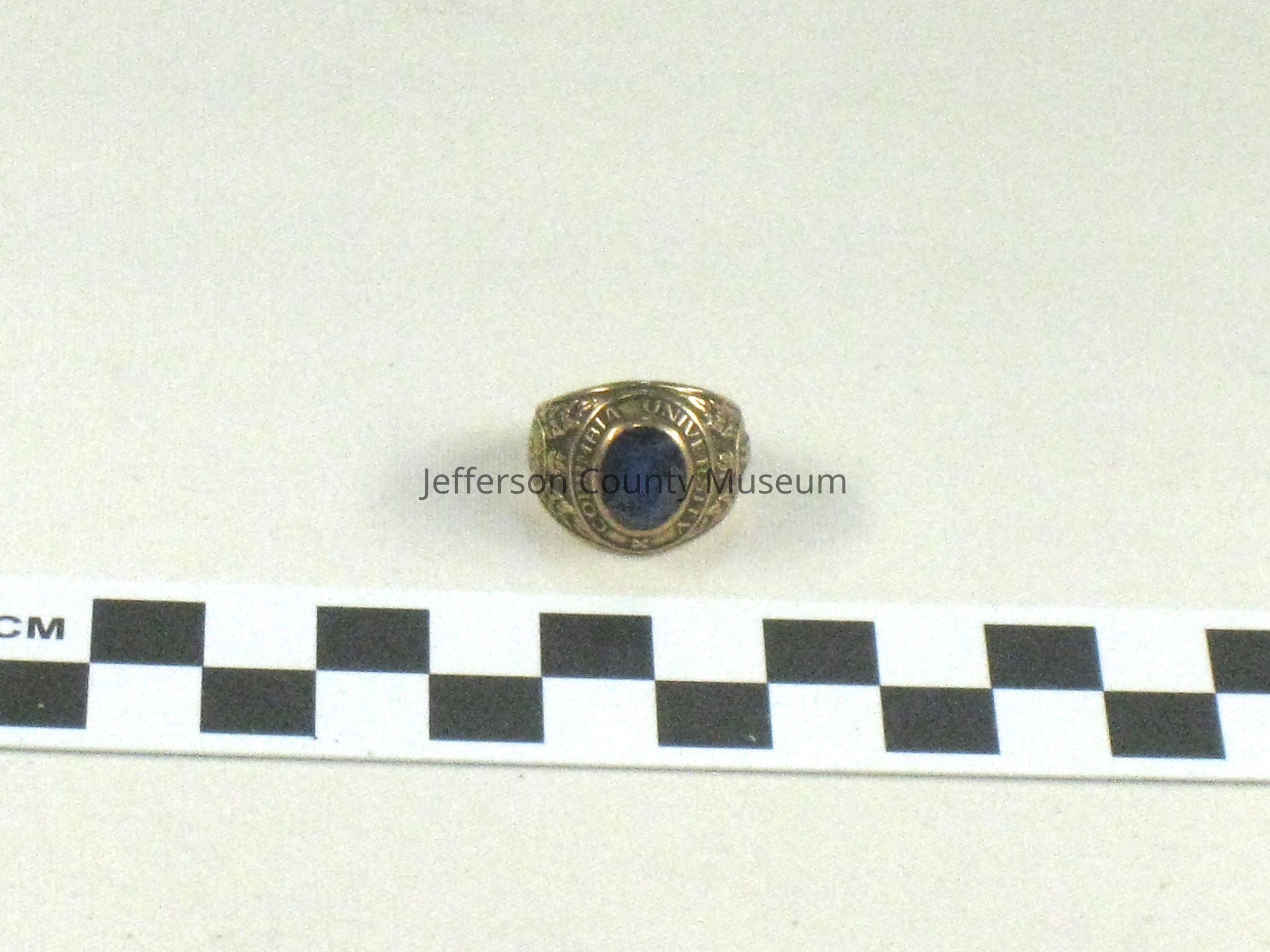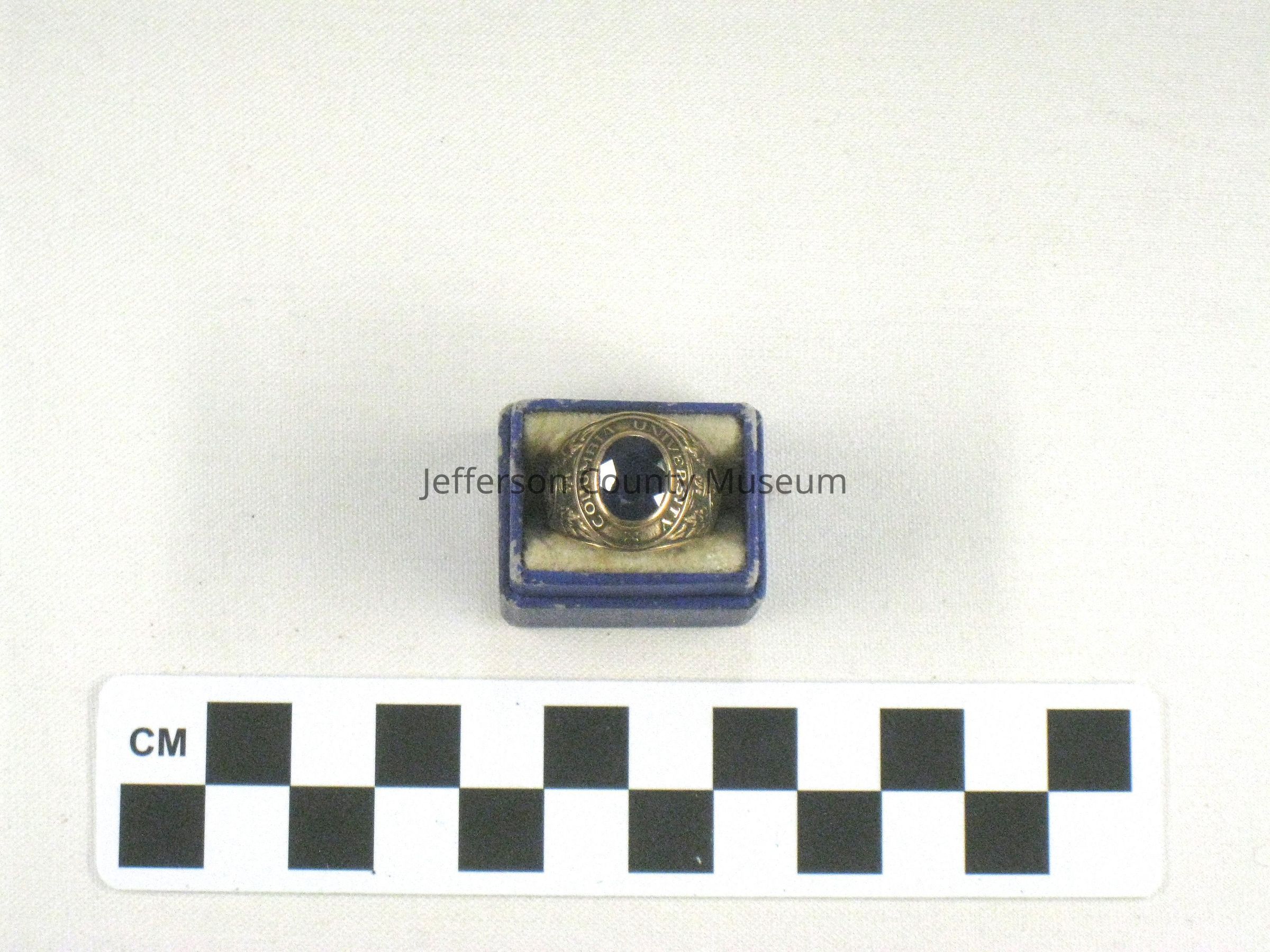 Class ring with blue stone. Around the stone is "COLUMBIA UNIVERSITY". On the sides of the ring are emblems of the university. Inside the ring is stamped "10 K 6".Acquisition