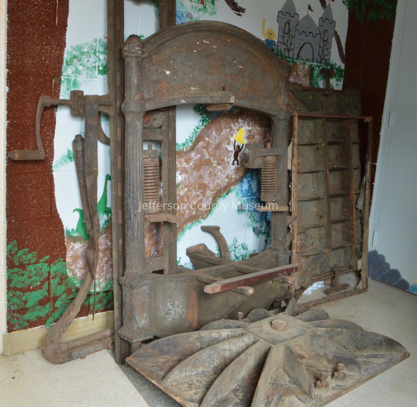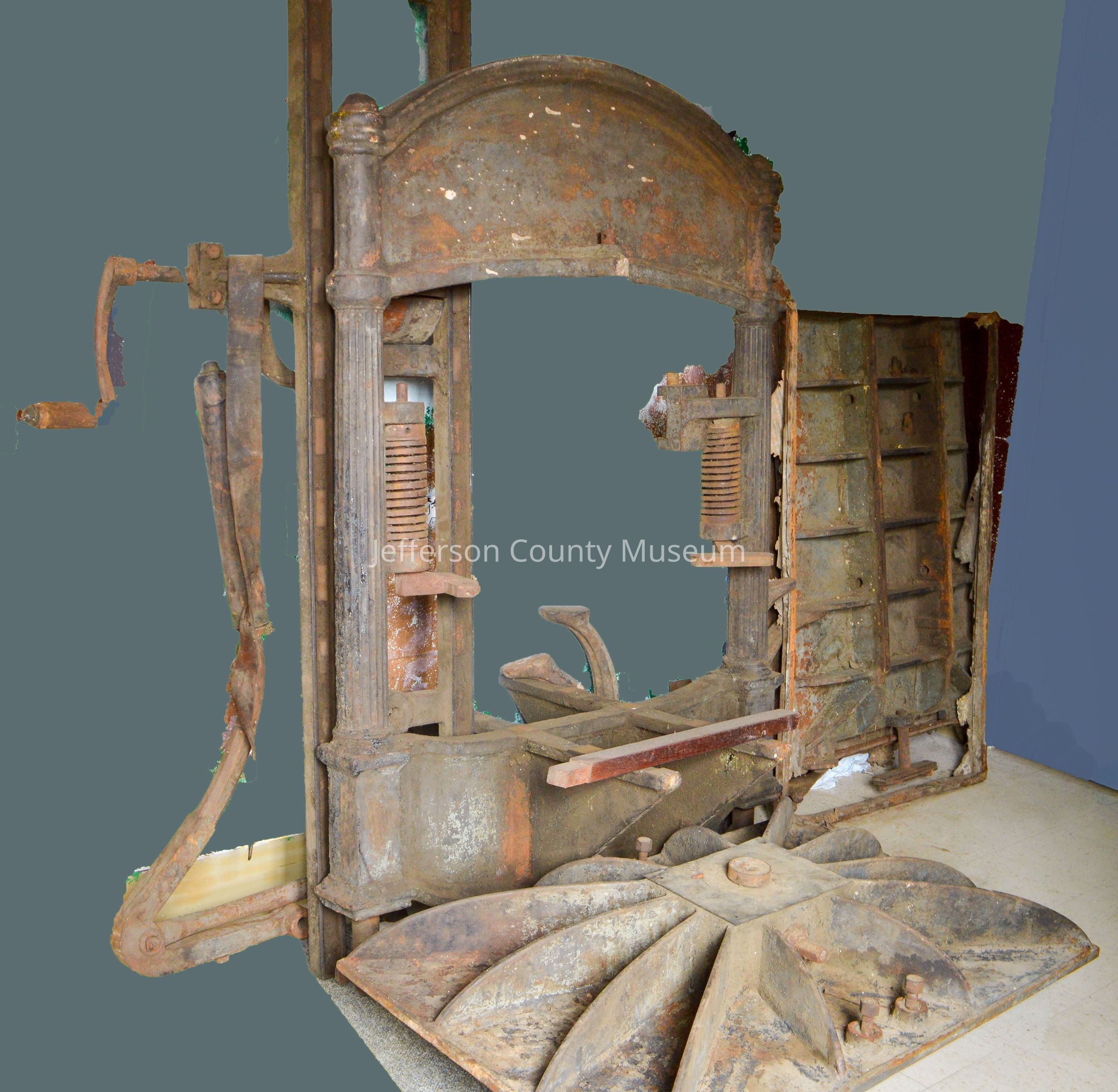 Various heavy iron and wood pieces for disassembled printing press (ca. 1830 -1840, according to deed of gift). Embossed on large metal piece "WASHINGTON PRESS R. HOE & CO. NEW - YORK. No. 2212". The image of George Washington is on left in a circle and the image of Benjamin Franklin is on right in circle.