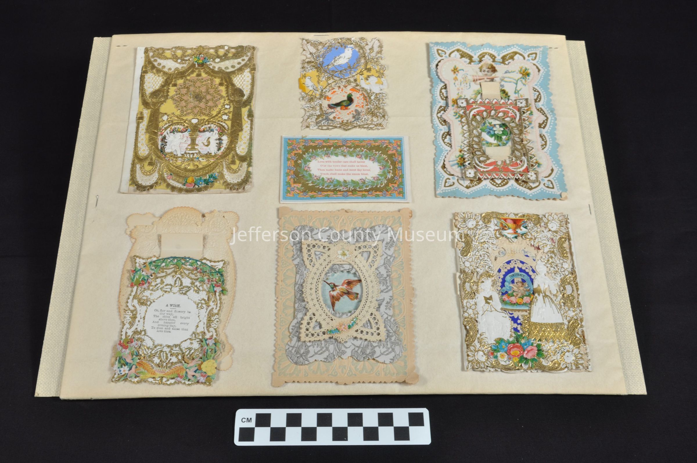 Seven Victorian-era Valentine cards glued to a board. All are fancy with filigree cutouts, birds, cherubs, flowers, etc.Acquisition