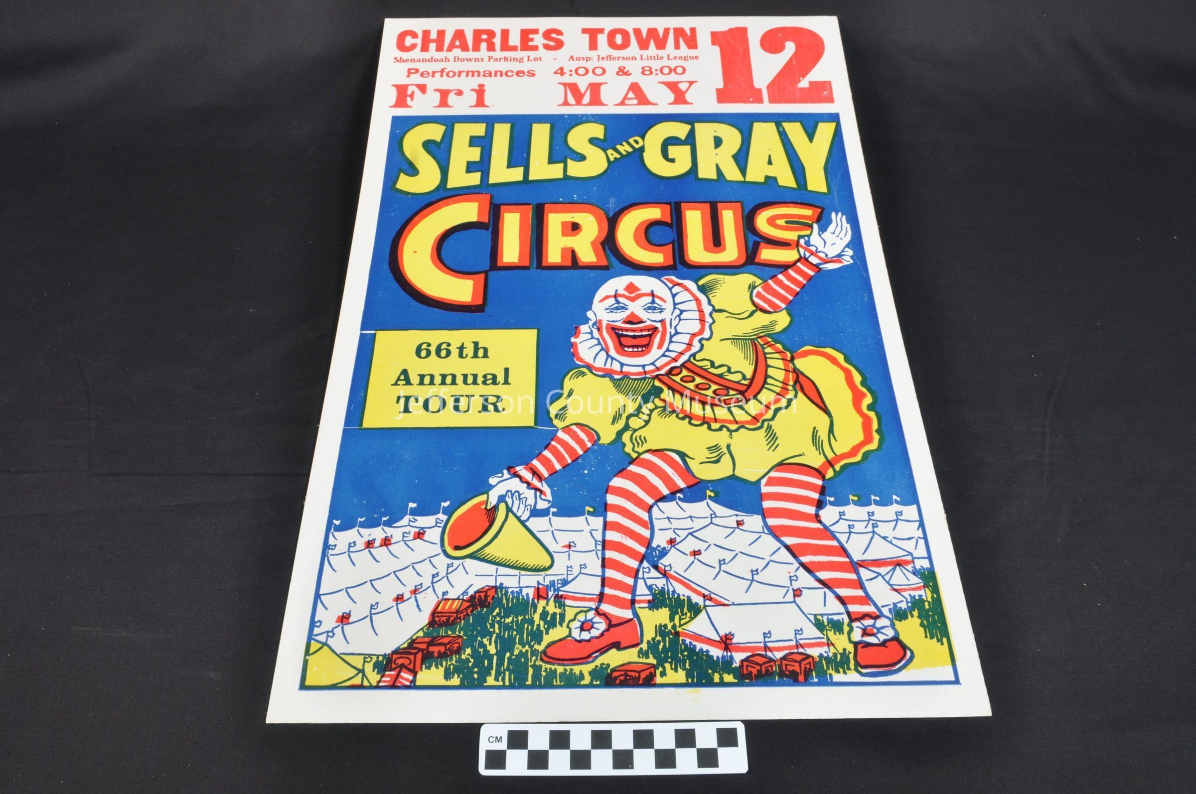 Circus poster with red, yellow, blue and green colors and clown with outspread arms, holding his pointed hat in his right hand. Many big-top tents in the background. Text on poster is "CHARLES TOWN Shenandoah Downs Parking Lot - Ausp: Jefferson Little League Performances 4:00 & 8:00 Fri. MAY 12 SELLS AND GRAY CIRCUS 66th Annual TOUR".Acquisition