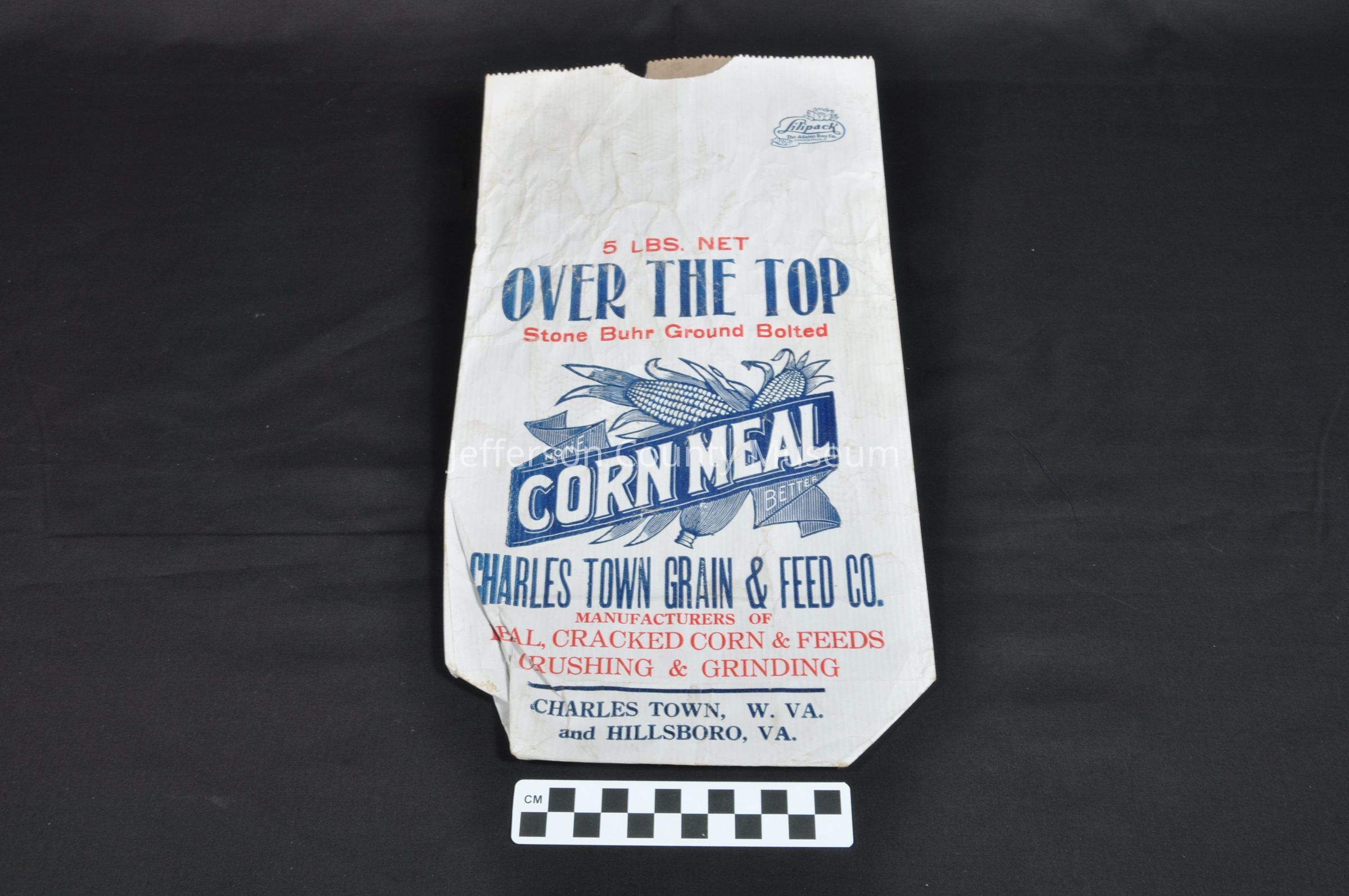 Paper bag for corn meal. Printed on the white bag in blue is "5 LBS. NET OVER THE TOP Stone Buhr Ground Bolted CORN MEAL NONE BETTER CHARLES TOWN GRAIN & FEED CO. MANUFACTURERS OF MEAL, CRACKED CORN & FEEDS CRUSHING & GRINDING CHARLES TOWN, W. VA. and HILLSBORO, VA." In red on the bottom is "Over the Top CORN MEAL THE ADAMS BAG CO. CHAGRIN FALLS, O."Acquisition