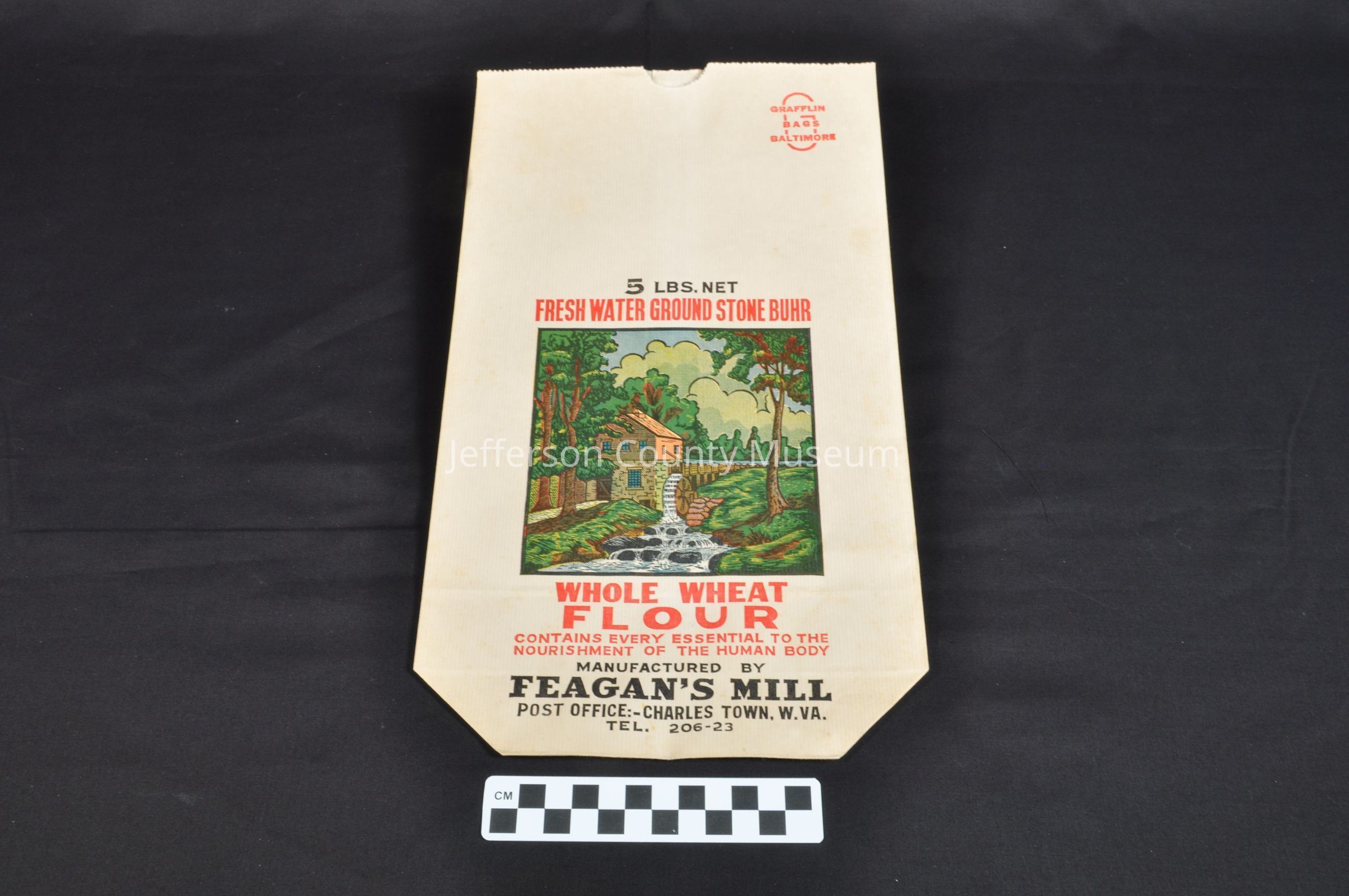 Paper flour bag printed with black and red letters. The scene of a grist mill on a stream with a mill race and wheel and trees on both sides is in center of bag. Text on bag "GRAFFLIN BAGS BALTIMORE" superimposed over a "G" is in upper right corner. In center "5 LBS NET FRESH WATER GROUND STONE BUHR WHOLE WHEAT FLOUR CONTAINS EVERY ESSENTIAL TO THE NOURISHMENT OF THE HUMAN BODY MANUFACTURED BY FEAGAN'S MILL POST OFFICE: CHARLES TOWN, W.VA. TEL. 206-23". On bottom of bag in red "WHOLE WHEAT FLOUR".Acquisition