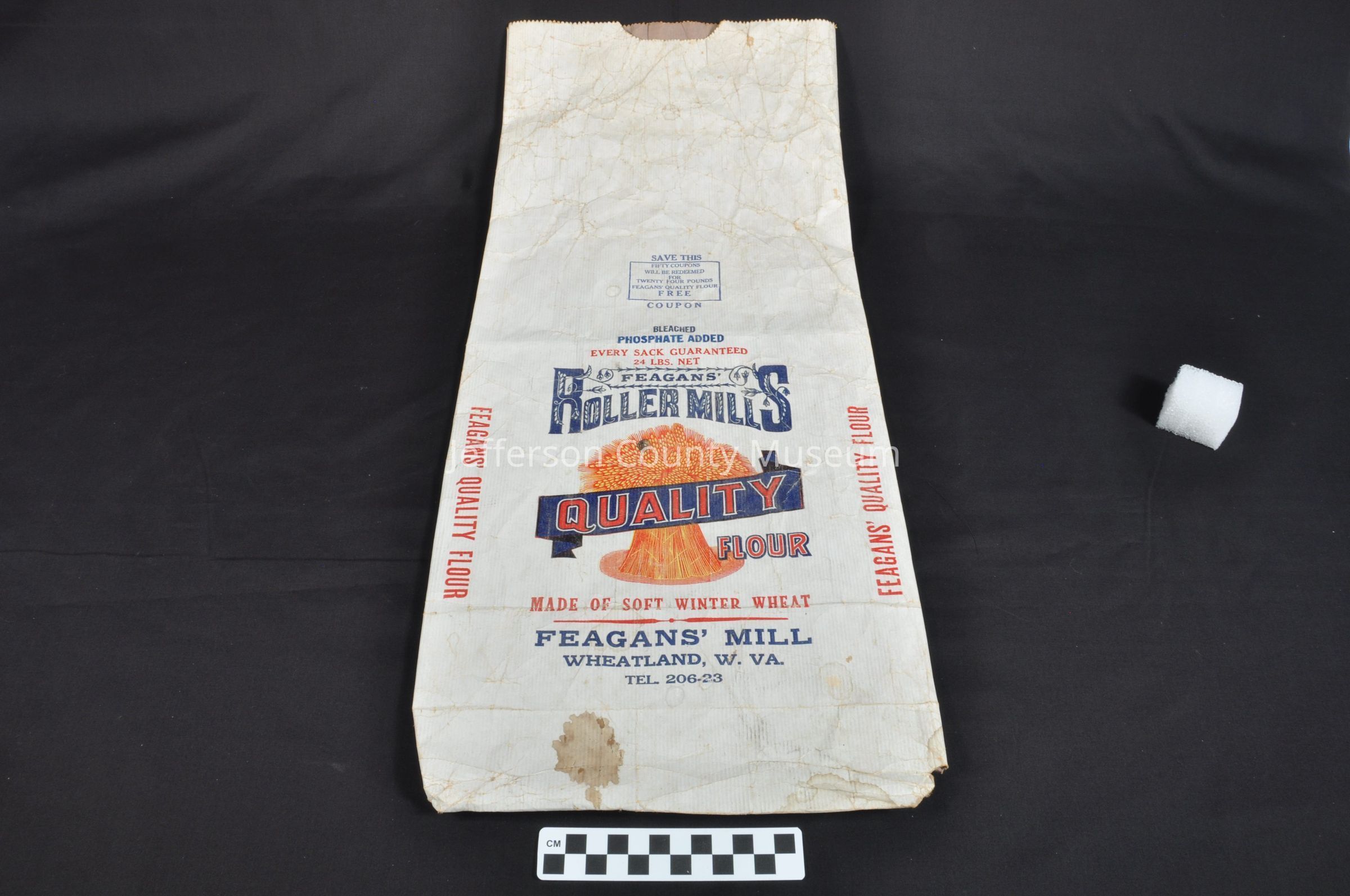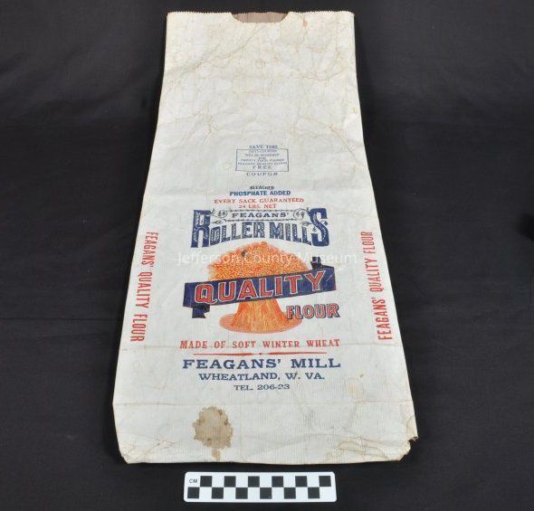 Paper flour bag with red and blue printing. A yellow and red shock of wheat is in center Text reads "SAVE THIS COUPON FIFTY COUPONS WILL BE REDEEMED FOR TWENTY FOUR POUNDS FEAGANS' QUALITY FLOUR FREE BLEACHED PHOSPHATE ADDED EVERY SACK GUARANTEED 24 LBS. NET FEAGANS' ROLLER MILLS QUALITY FLOUR MADE OF SOFT WINTER WHEAT FEAGANS' MILL WHEATLAND, W. VA. TEL. 206-23". FEAGANS' QUALITY FLOUR" on each side in red. On bottom in blue rectangle "FEAGANS' QUALITY FLOUR".Acquisition