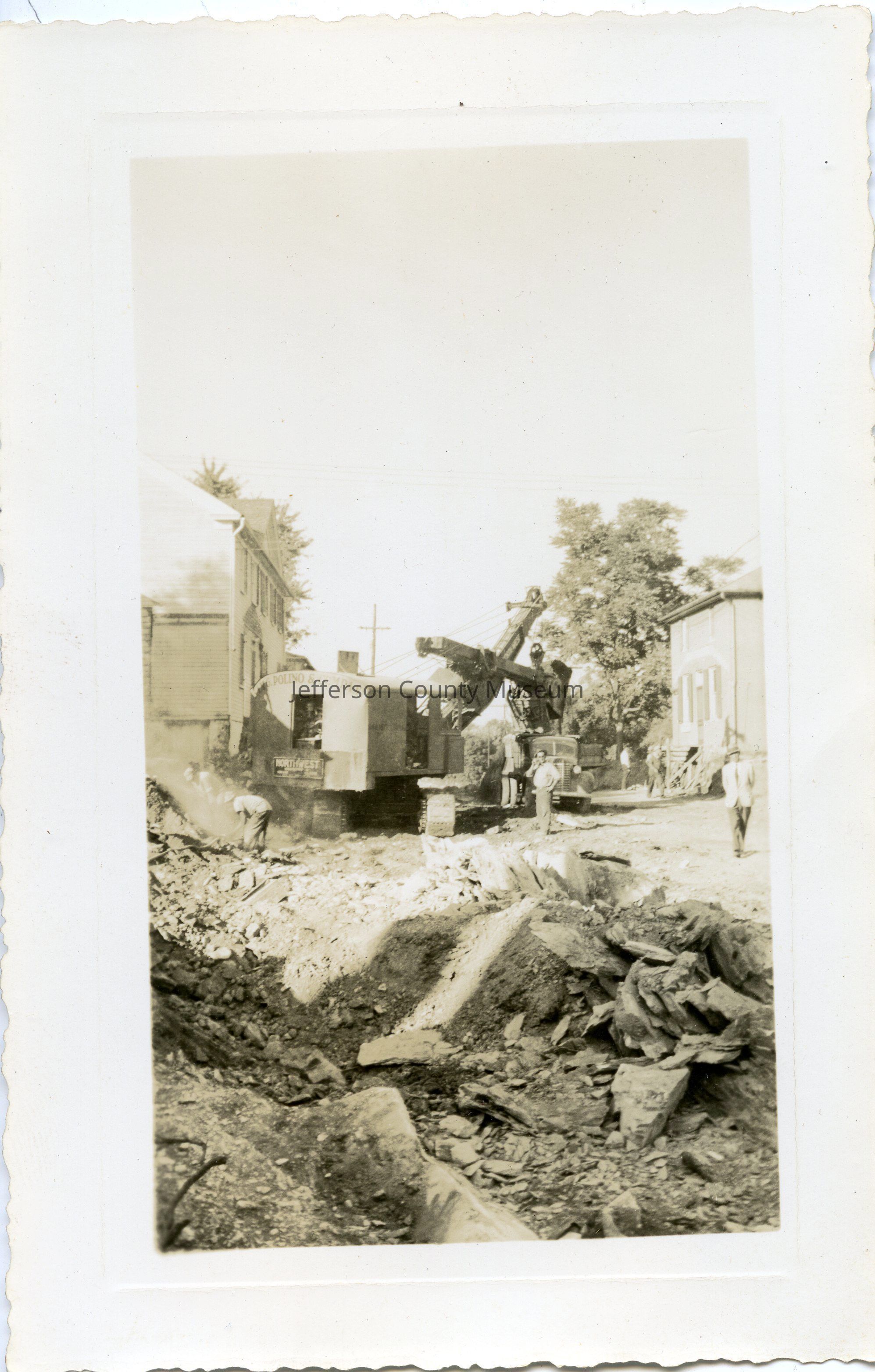 Looking north during road construction on Route 340 in Rippon at intersection of Withers-Larue Road to remove rise in road. Still standing today (1/24/2018) are Wilt Store (Jack & Mary Wilt) on right and Sylvester/Heskett residence across from it.