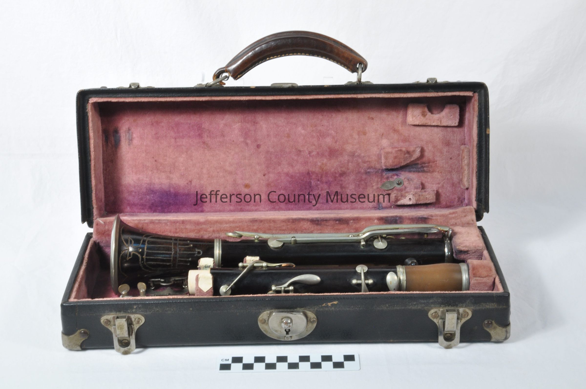 Wood and metal clarinet in three pieces in case. Carved on the bell are leaves, a lyre and scallop design. Two reeds and an additional reed holder are in the case. There is also a metal music sheet holder in the case in the shape of a lyre. The case is covered with dark brown leather or Leatherette, has a leather handle and metal corner protecters. There is a metal tag on the case that reads "BUESCHER ELKHART, IND."Acquisition