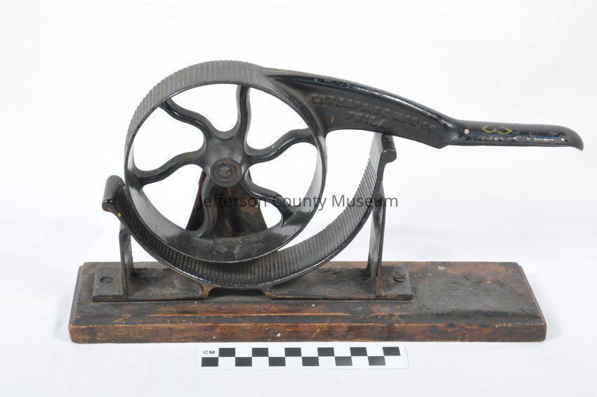 Iron crimper with handle and wheel. The handle and wheel are attached to a half round piece of iron that has crimping ridges as well. Mounted on a wooden base. Embossed on handle "ENTERPRISE MFG. CO. PHILA.". On the half round piece is "PAT AUG 7 1867 NO 2".Acquisition